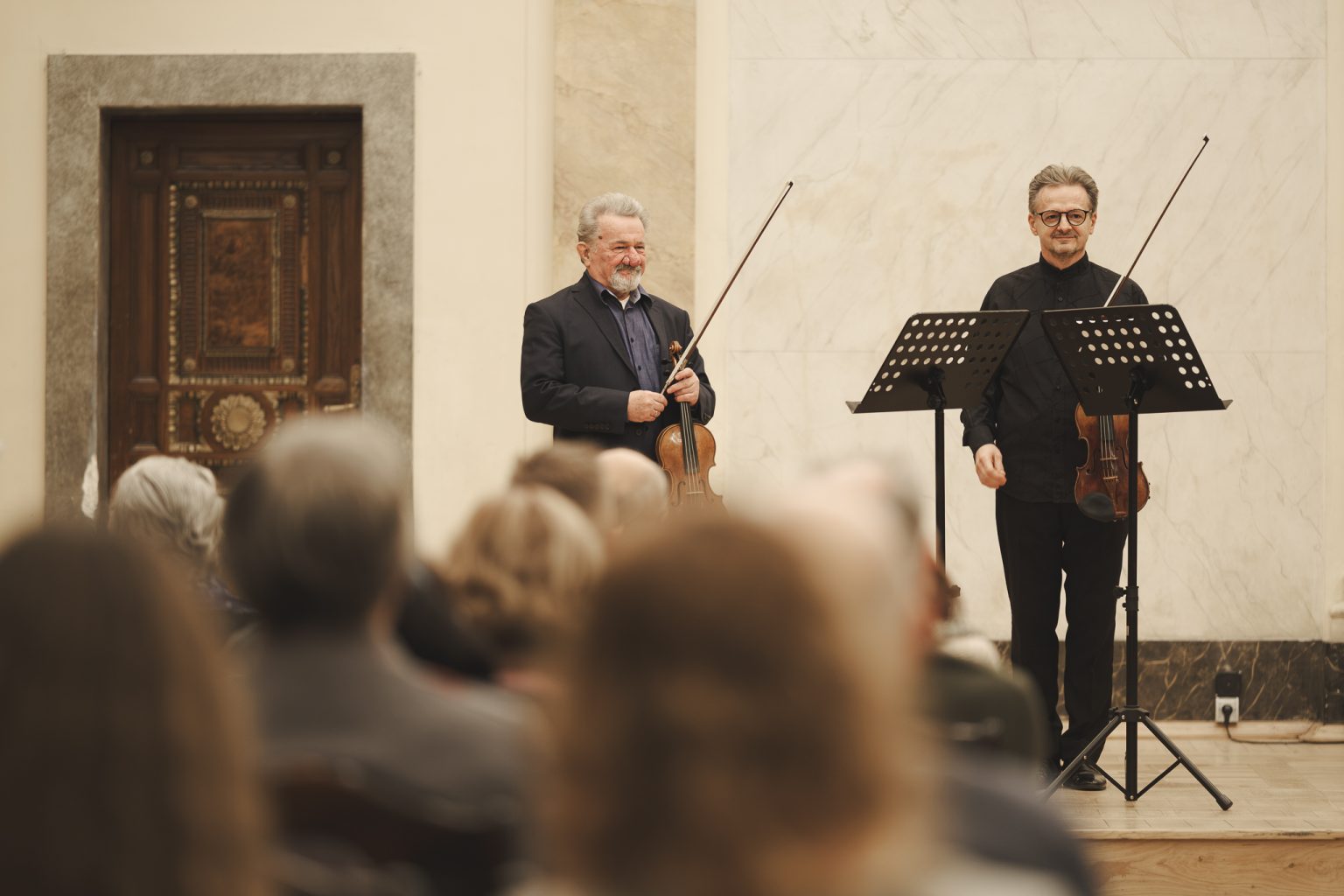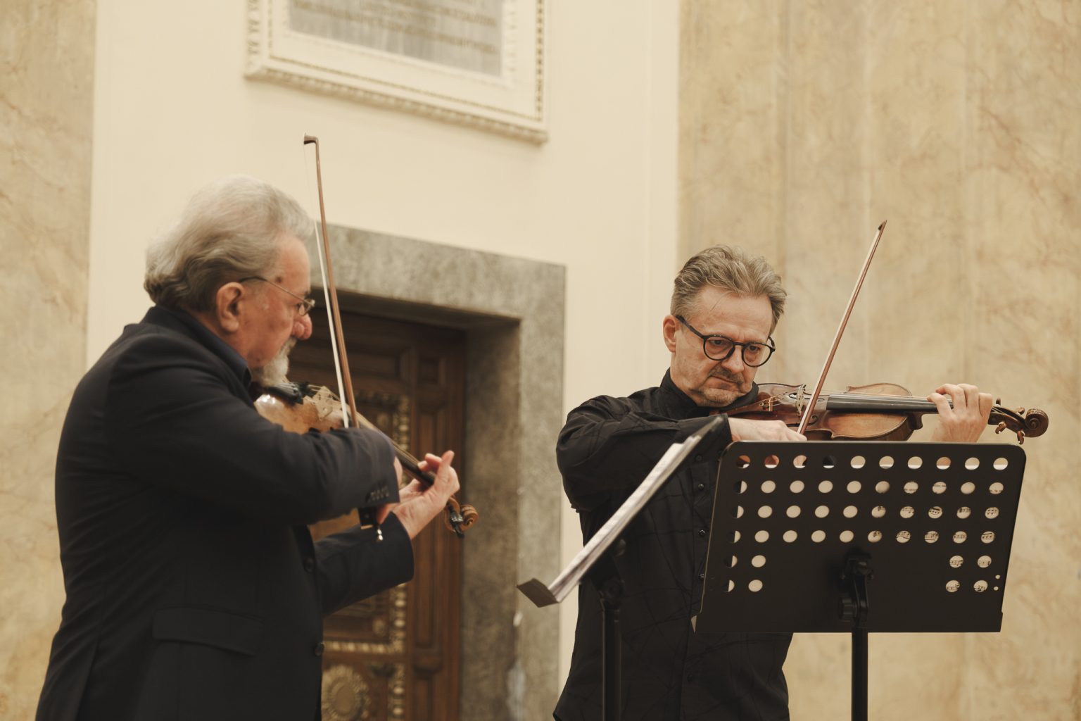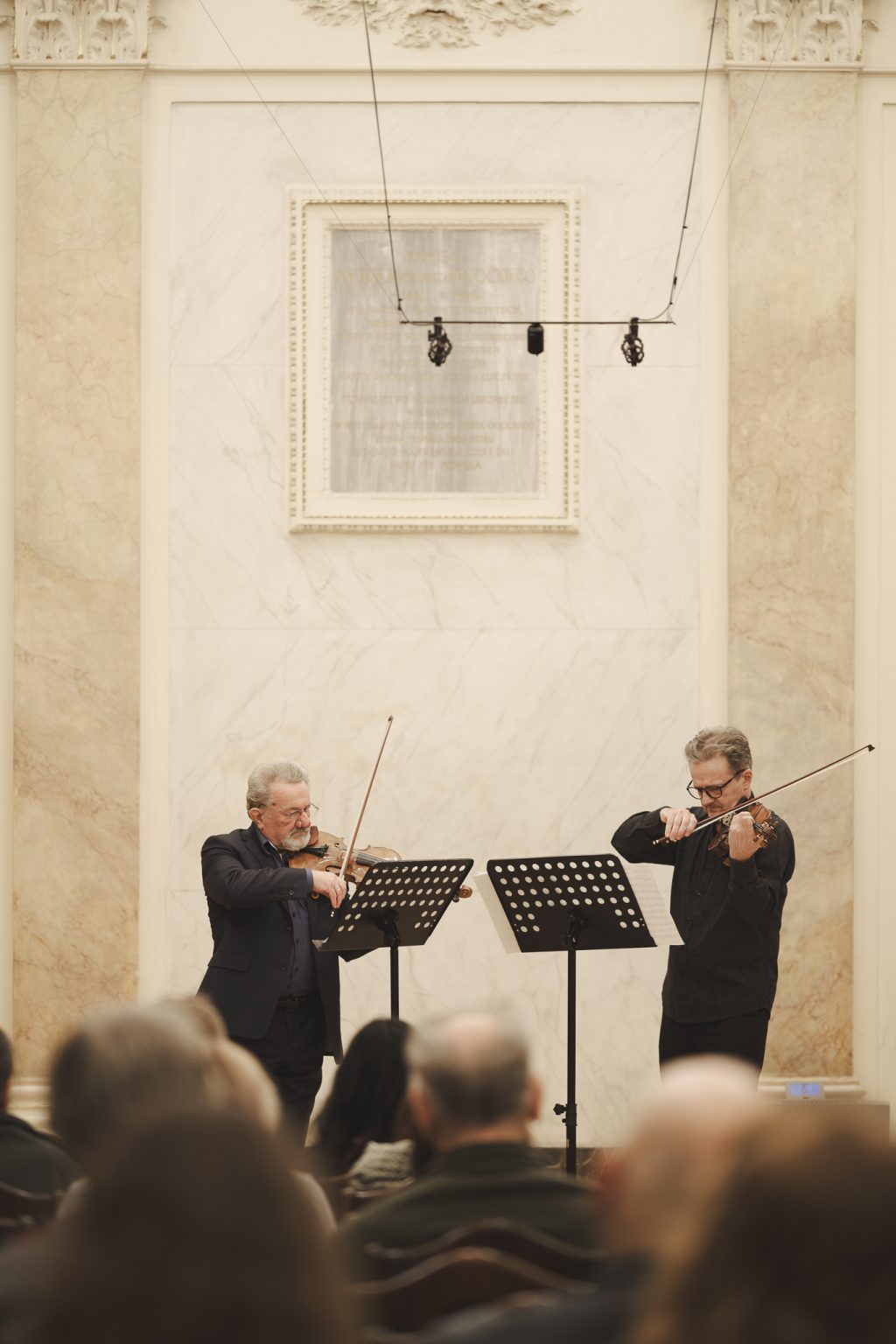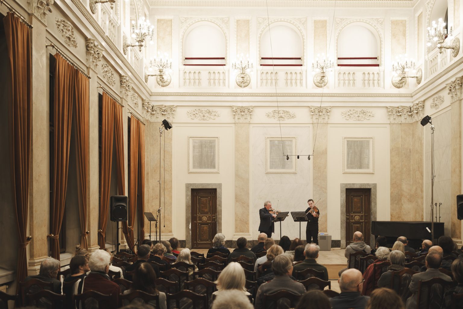 Koncert w wykonaniu Daniela Stabrawy (skrzypce), Piotra Tarcholika (skrzypce) i Dawida Jadamusa (altówka), który odbył się w Auli Florianka w ramach 5. Festiwalu duetów „A due” (7-11.12.2025).