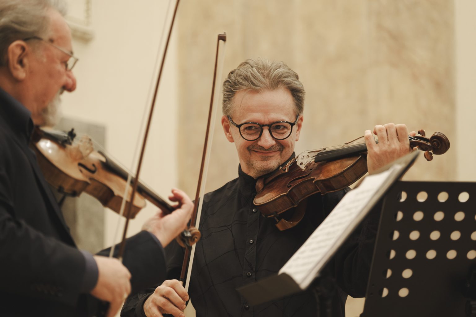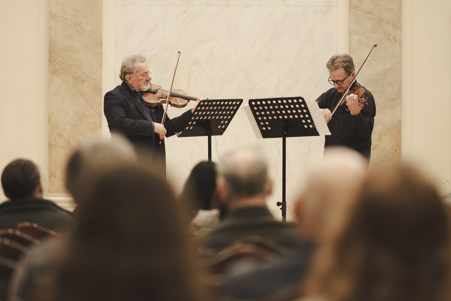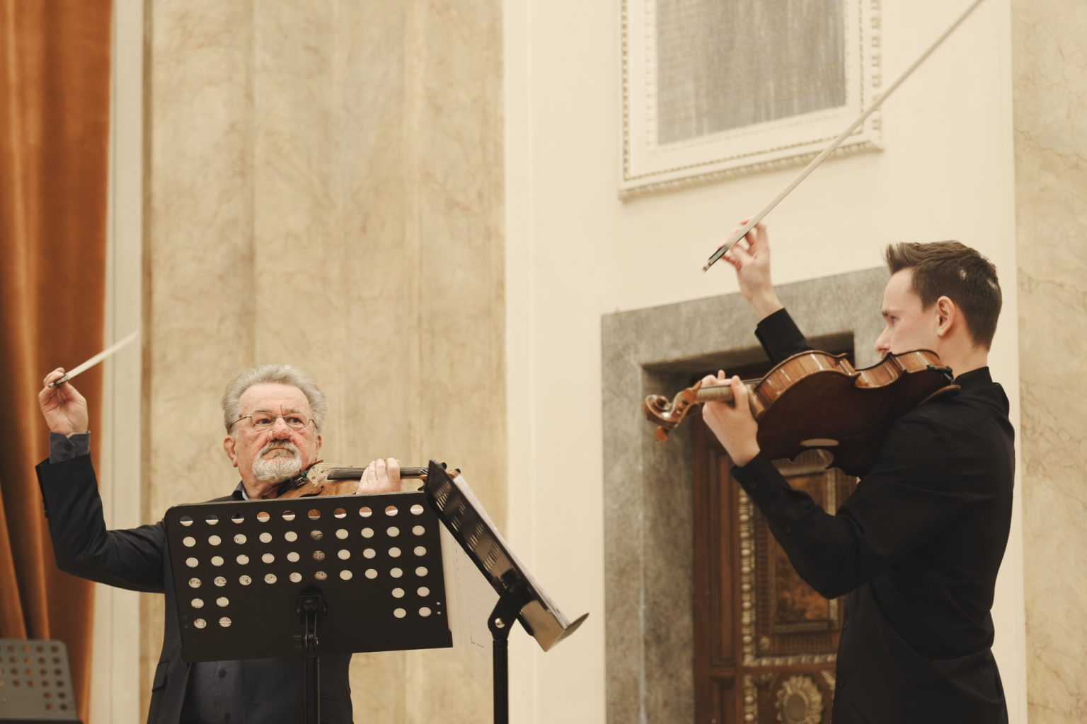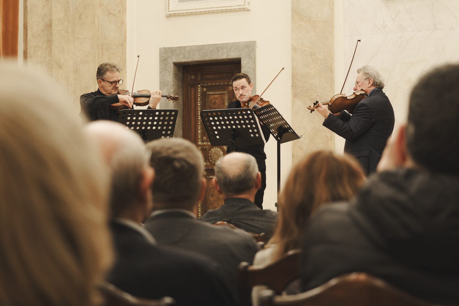 Koncert w wykonaniu Daniela Stabrawy (skrzypce), Piotra Tarcholika (skrzypce) i Dawida Jadamusa (altówka), który odbył się w Auli Florianka w ramach 5. Festiwalu duetów „A due” (7-11.12.2025).