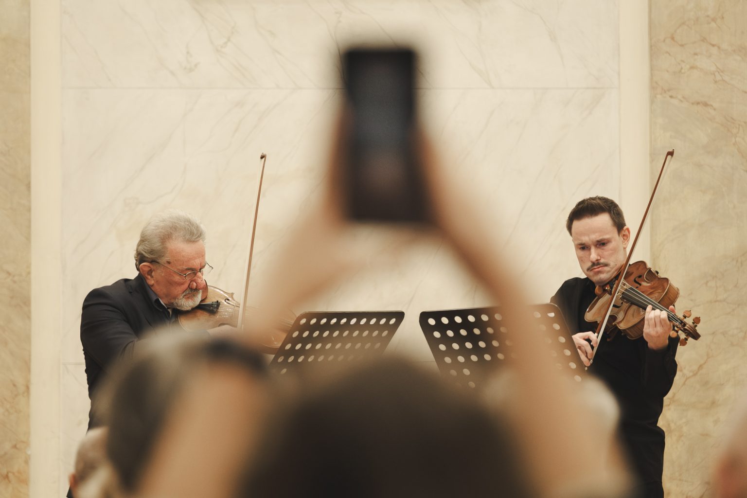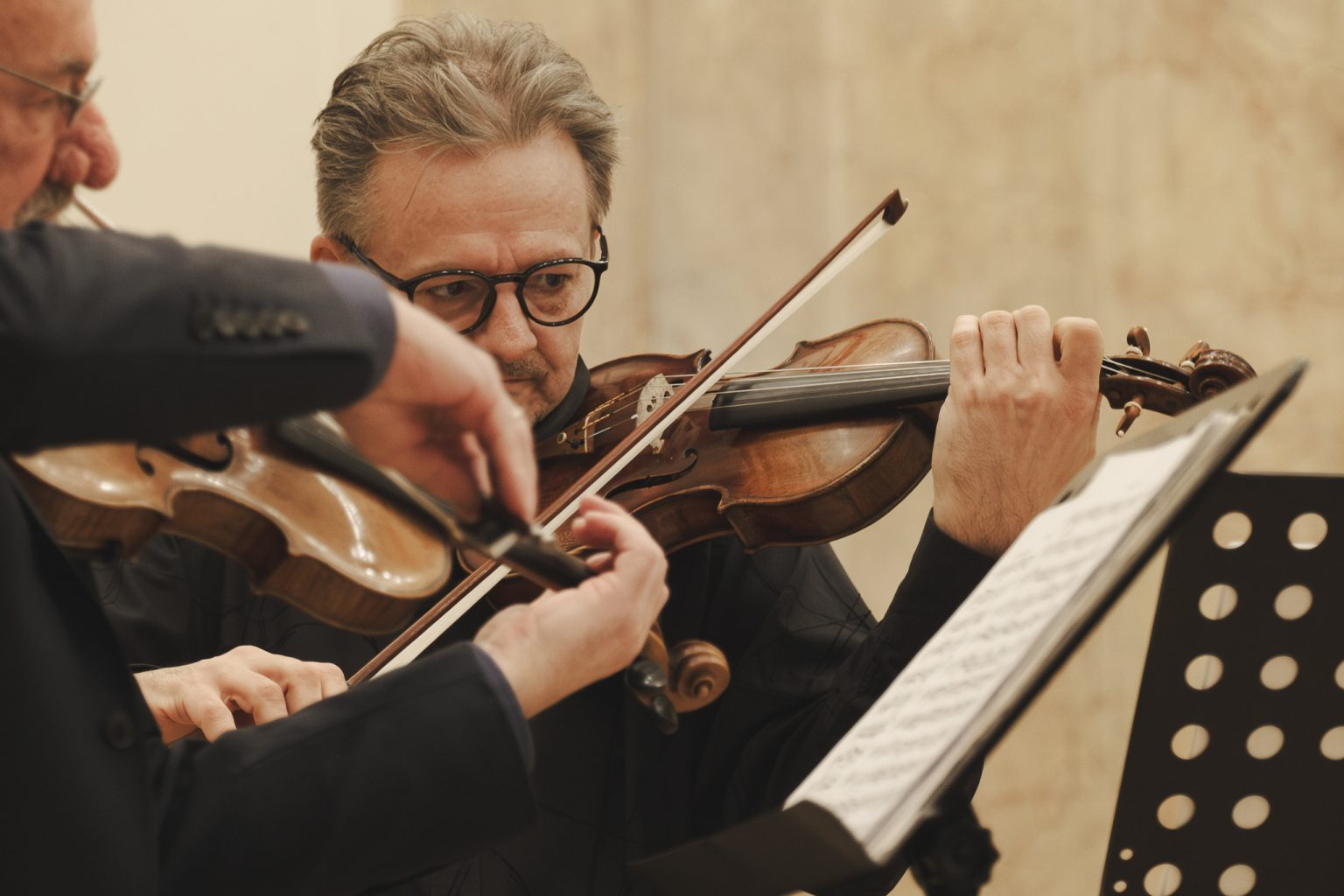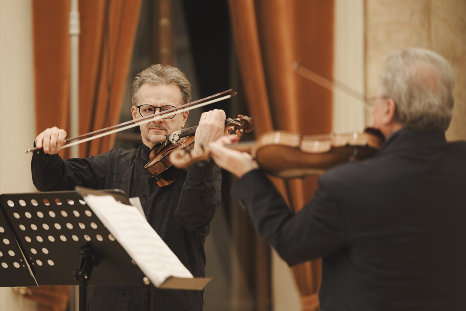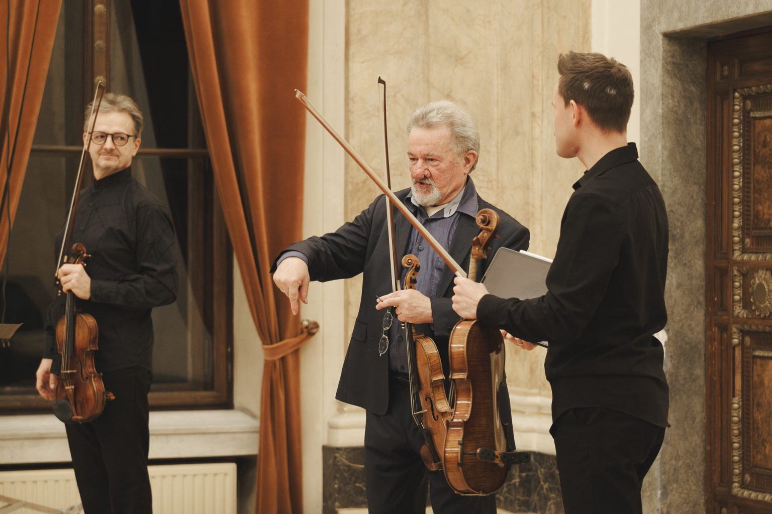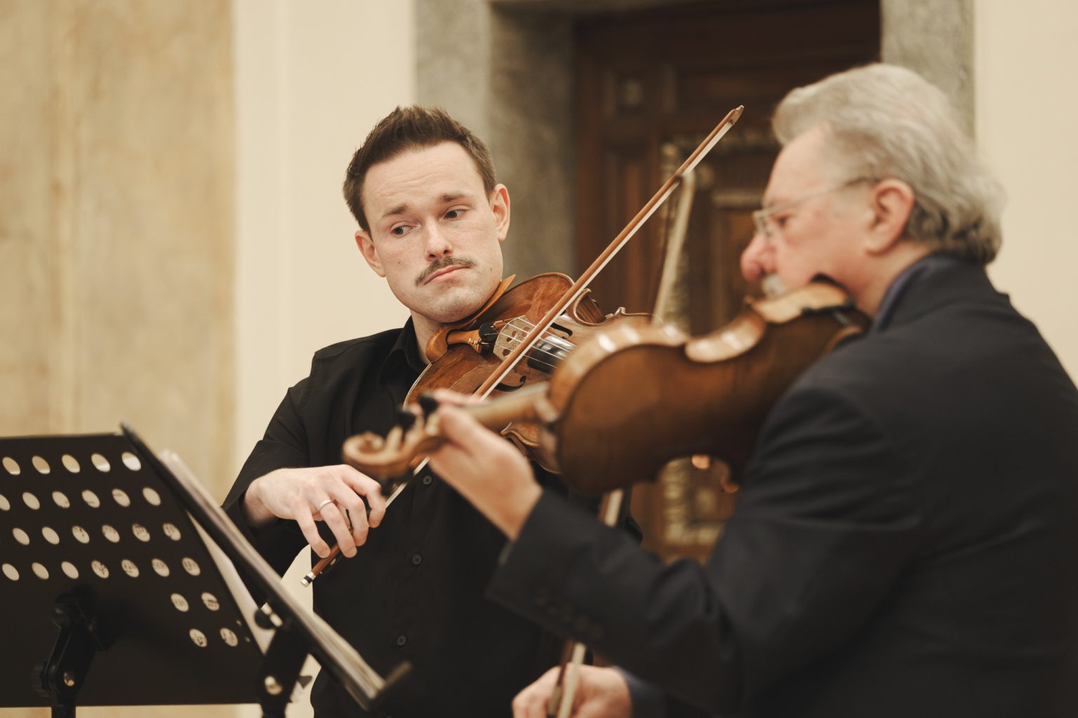 Koncert w wykonaniu Daniela Stabrawy (skrzypce), Piotra Tarcholika (skrzypce) i Dawida Jadamusa (altówka), który odbył się w Auli Florianka w ramach 5. Festiwalu duetów „A due” (7-11.12.2025).