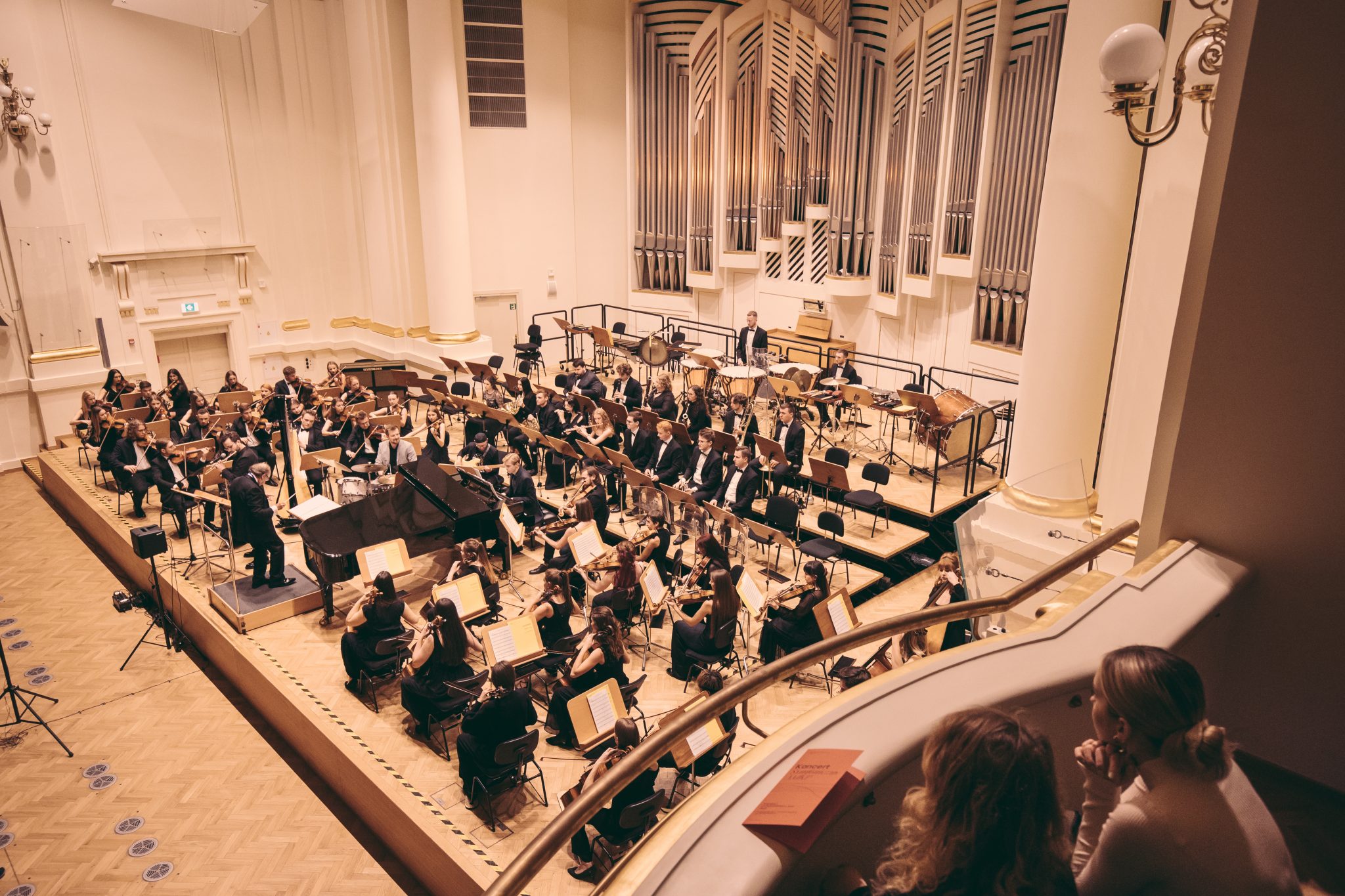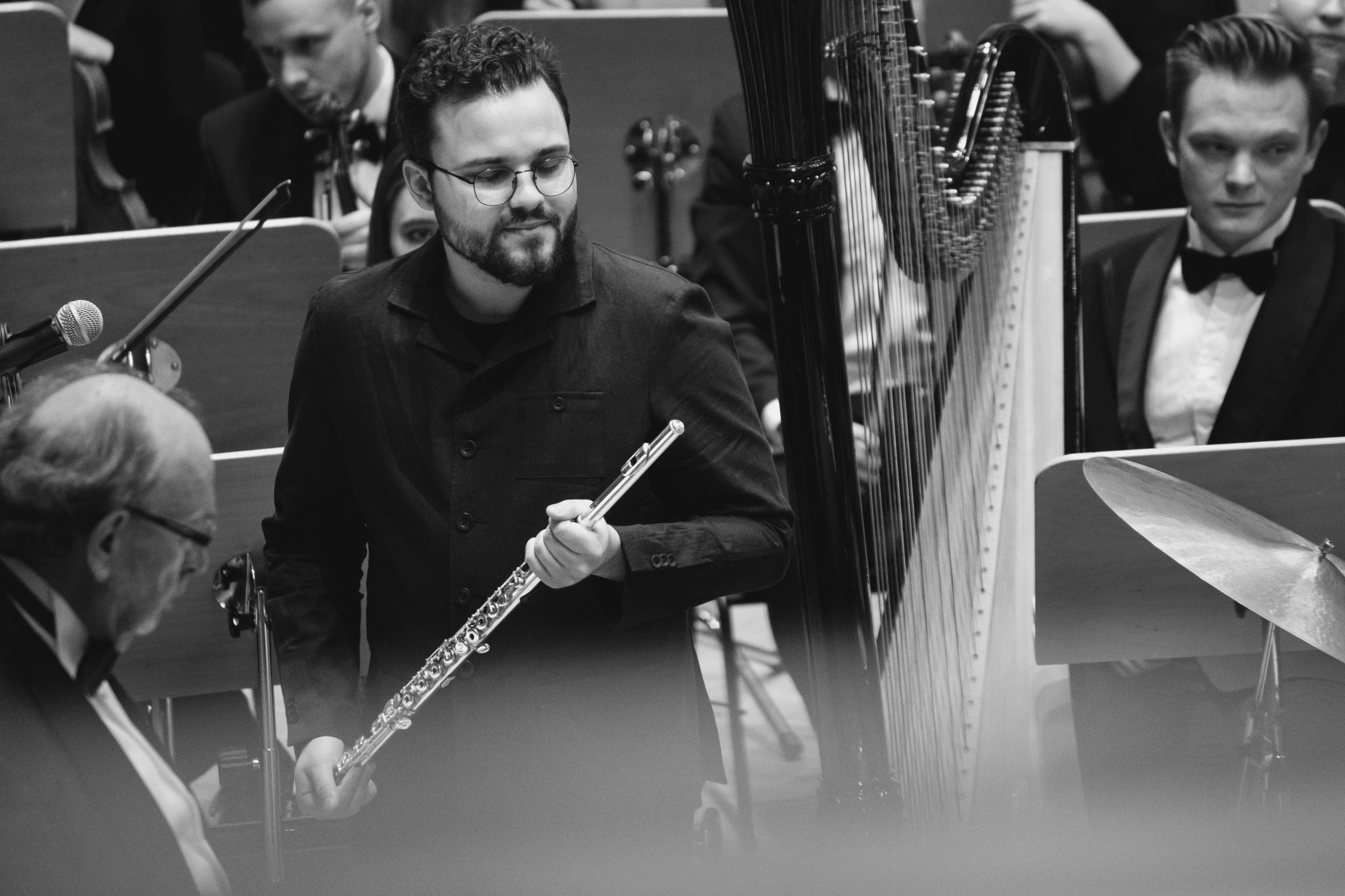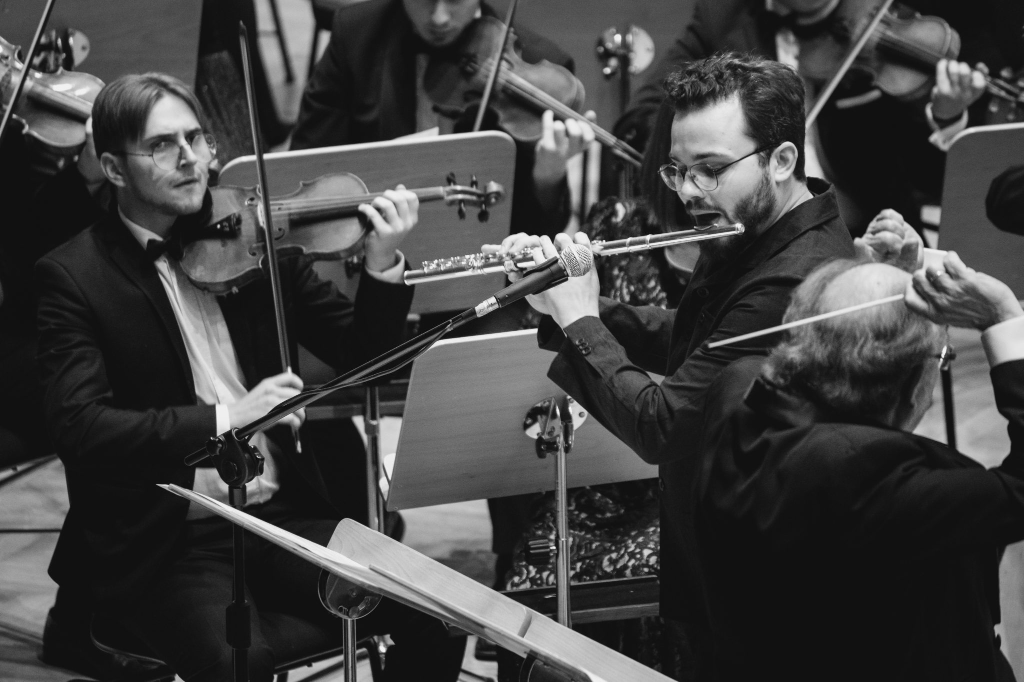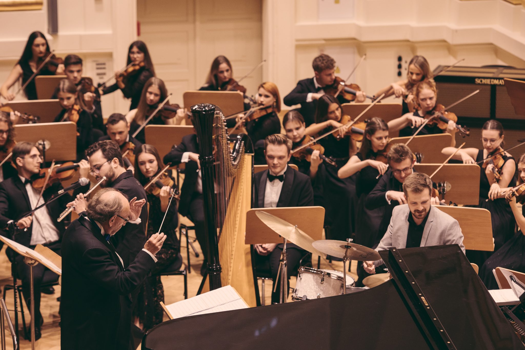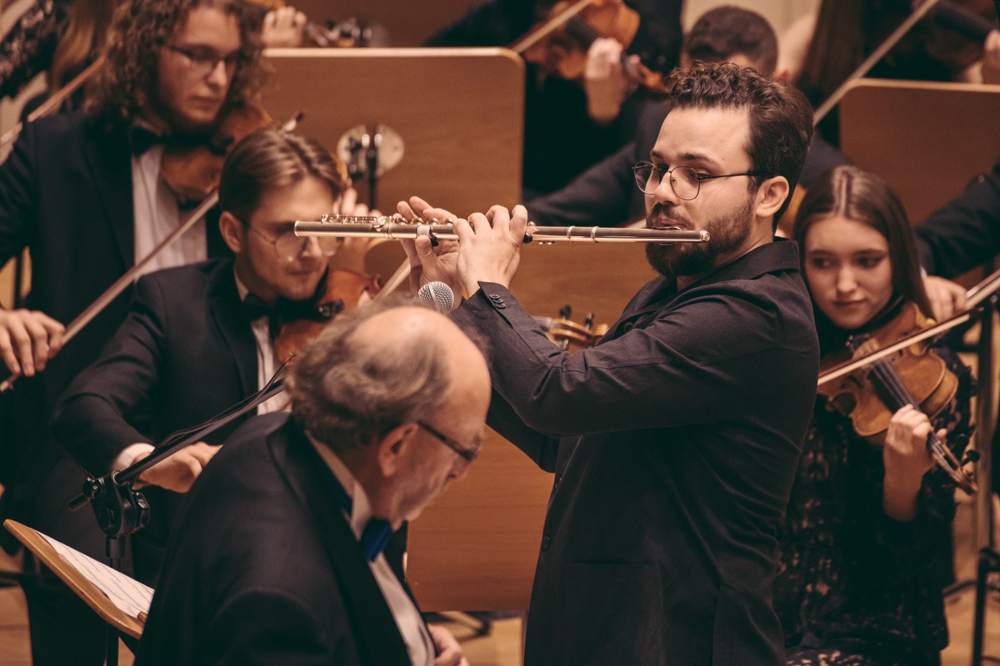 Koncert Orkiestry Symfonicznej w Filharmonii Krakowskiej pod dyrygenturą Rafała Jacka Delekty, z udziałem solistów – Łukasza Jankowskiego (flet) i Marka Szlezera (fortepian), fot. Piotr Markowski.