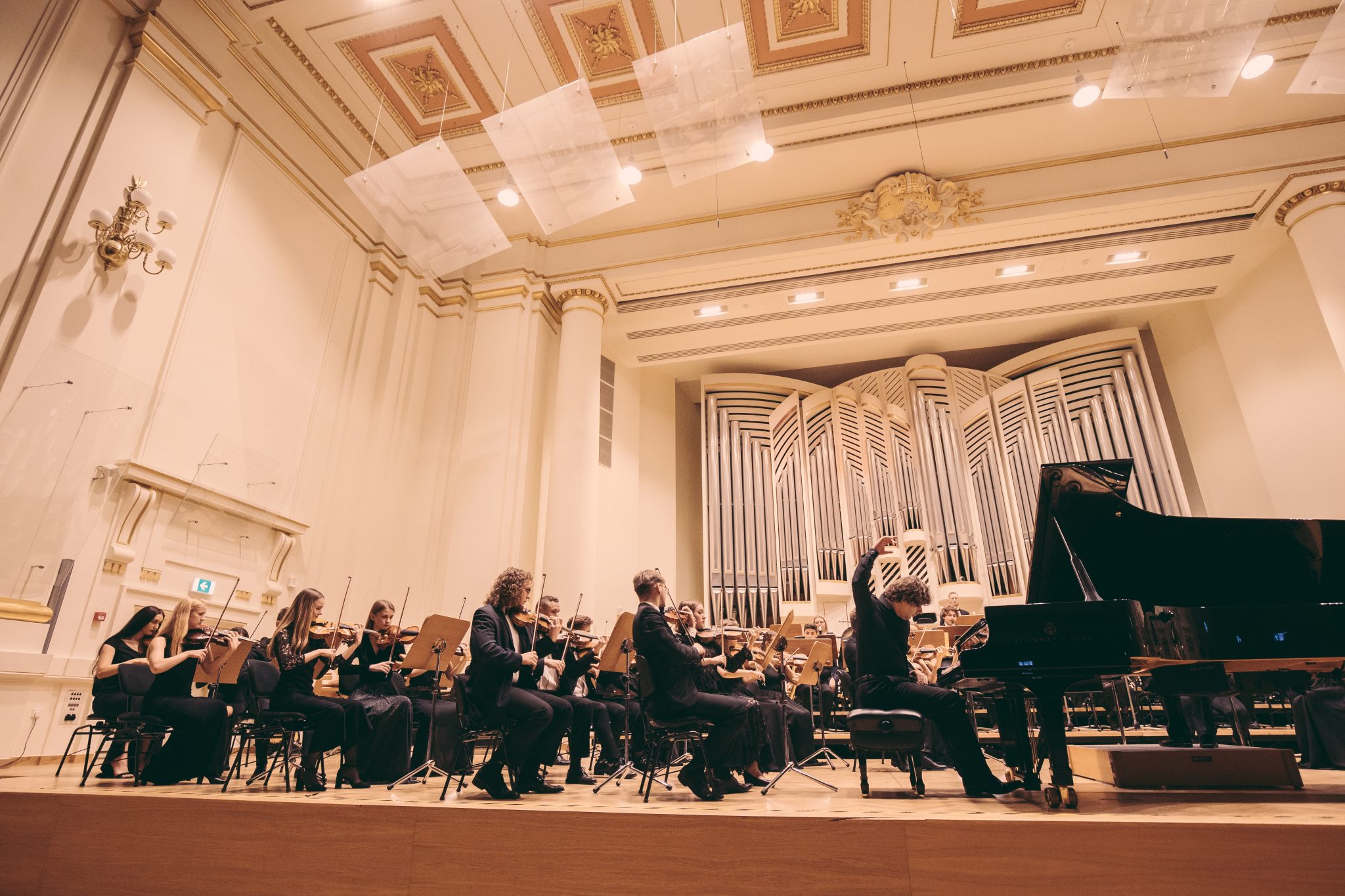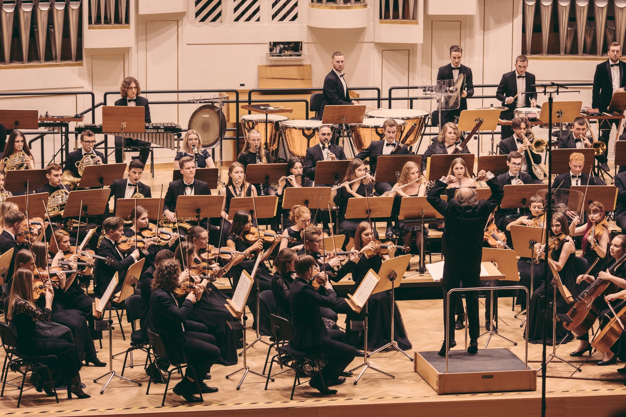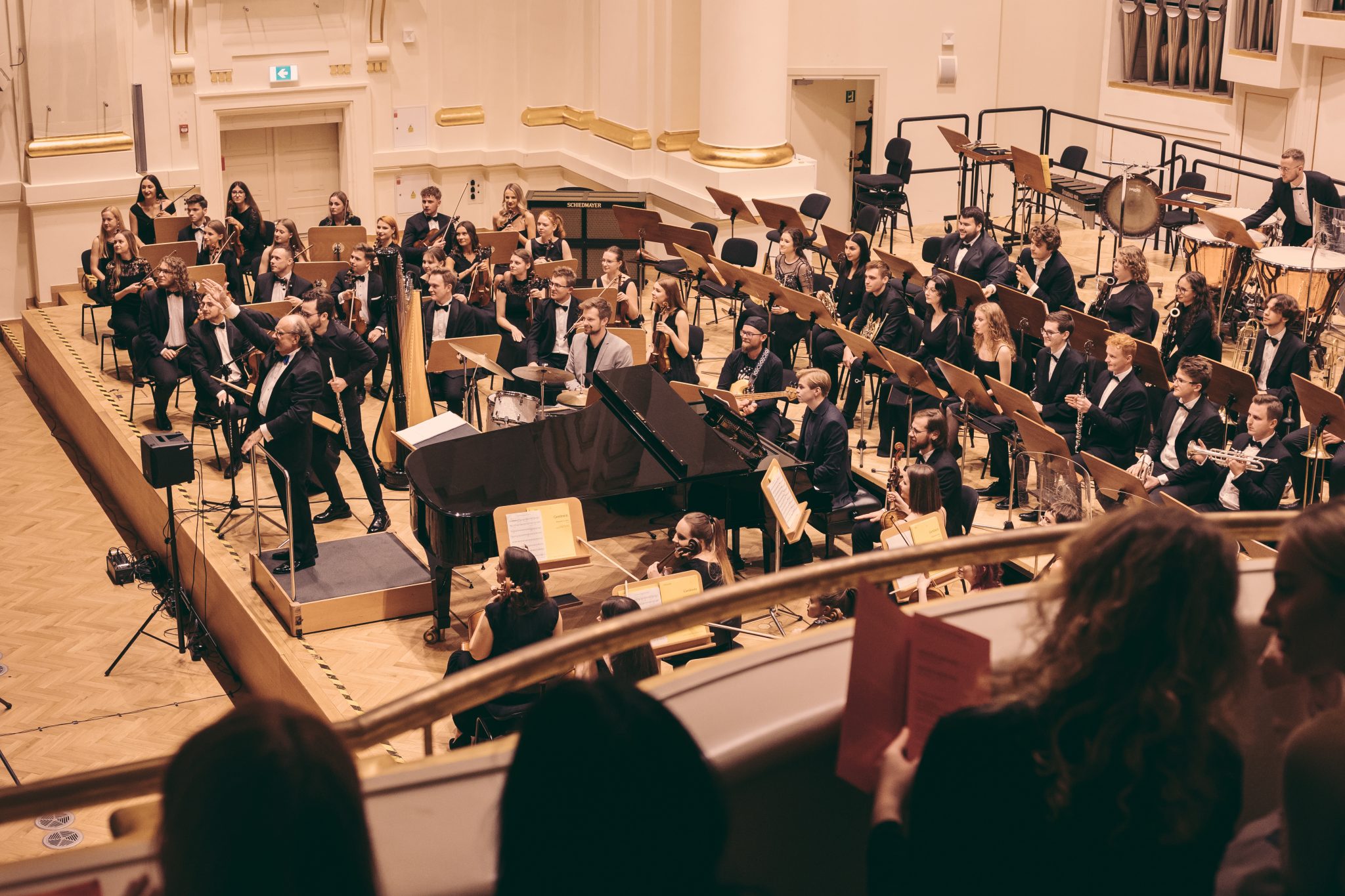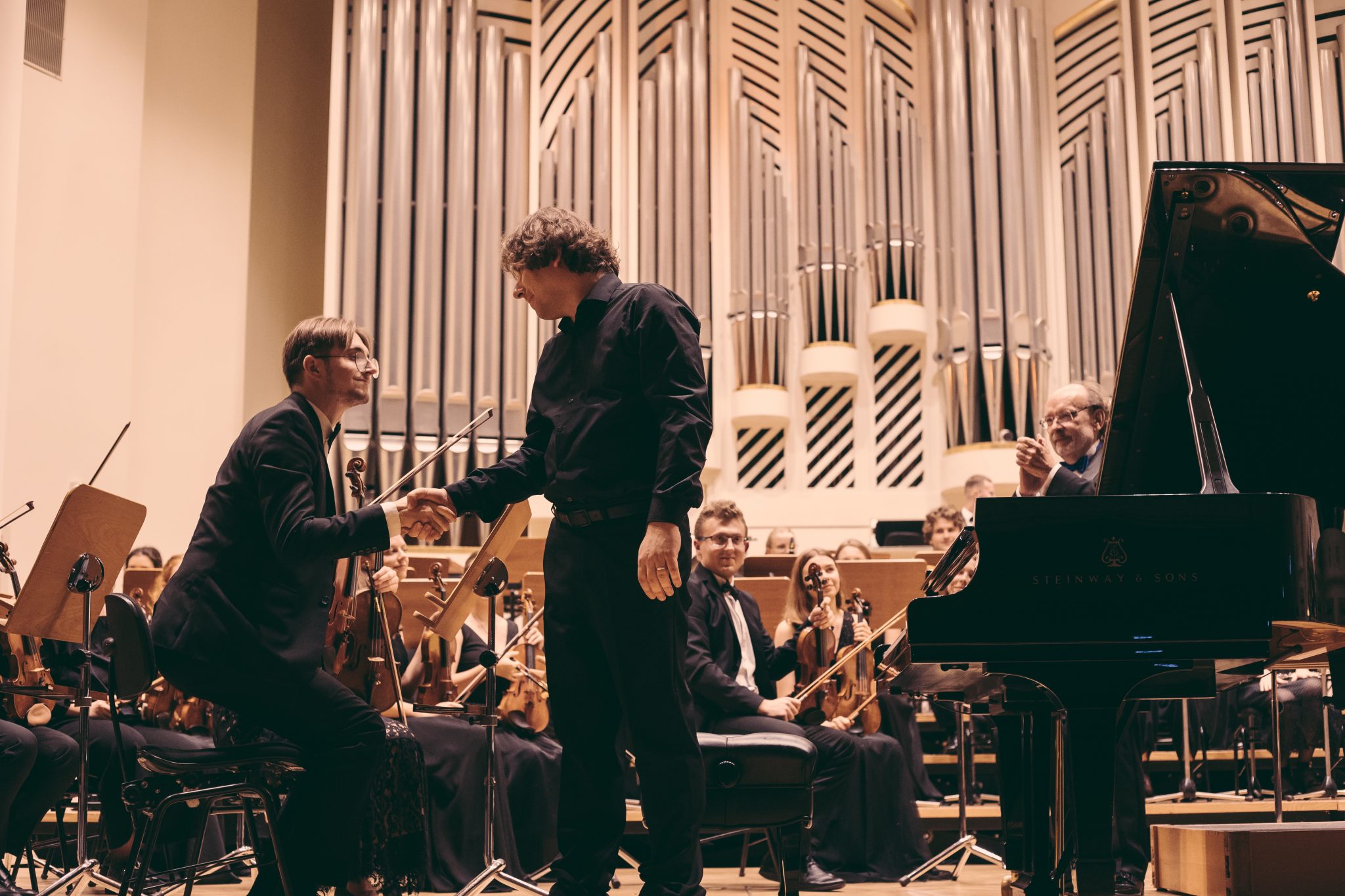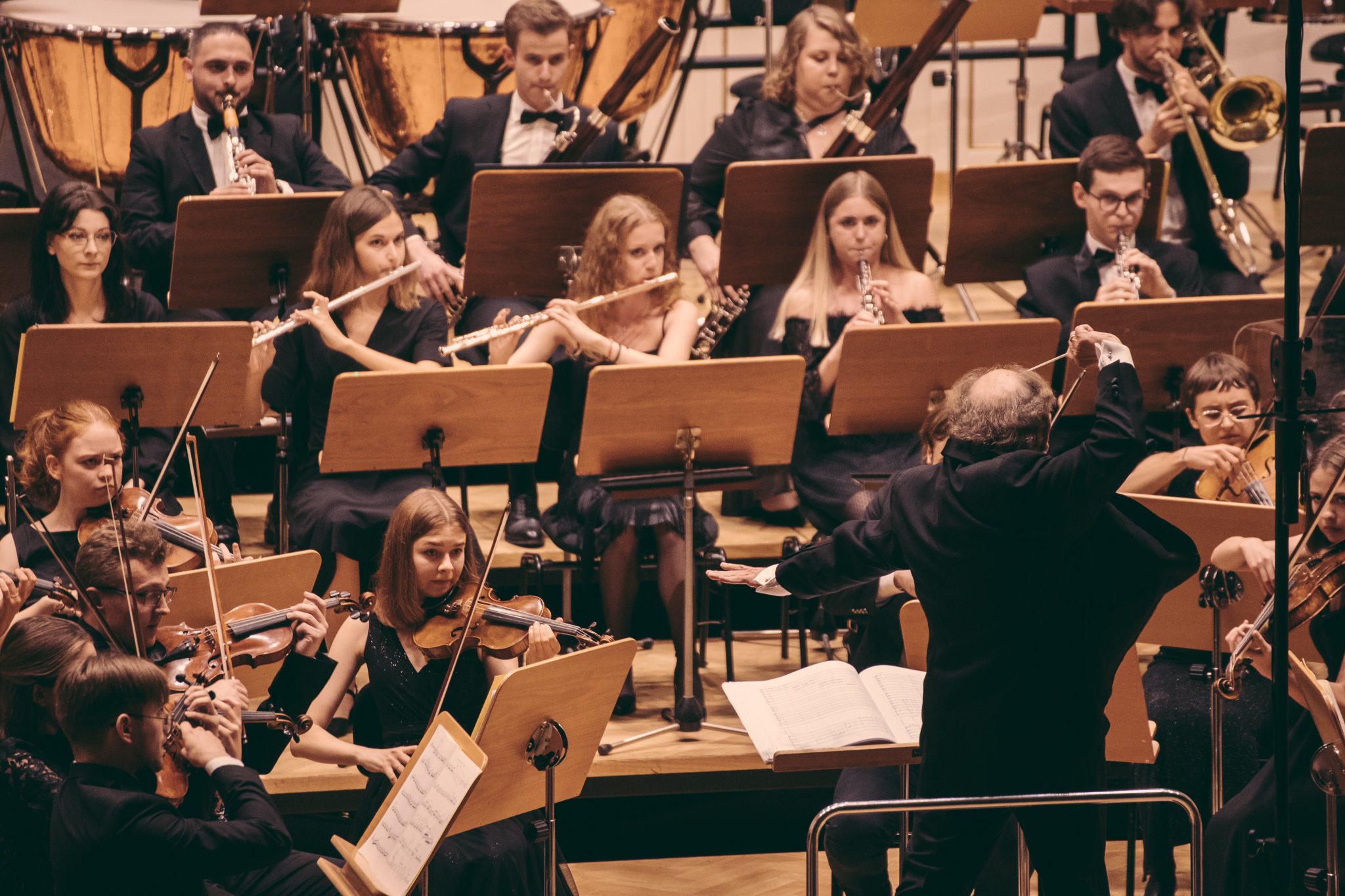 Koncert Orkiestry Symfonicznej w Filharmonii Krakowskiej pod dyrygenturą Rafała Jacka Delekty, z udziałem solistów – Łukasza Jankowskiego (flet) i Marka Szlezera (fortepian), fot. Piotr Markowski.