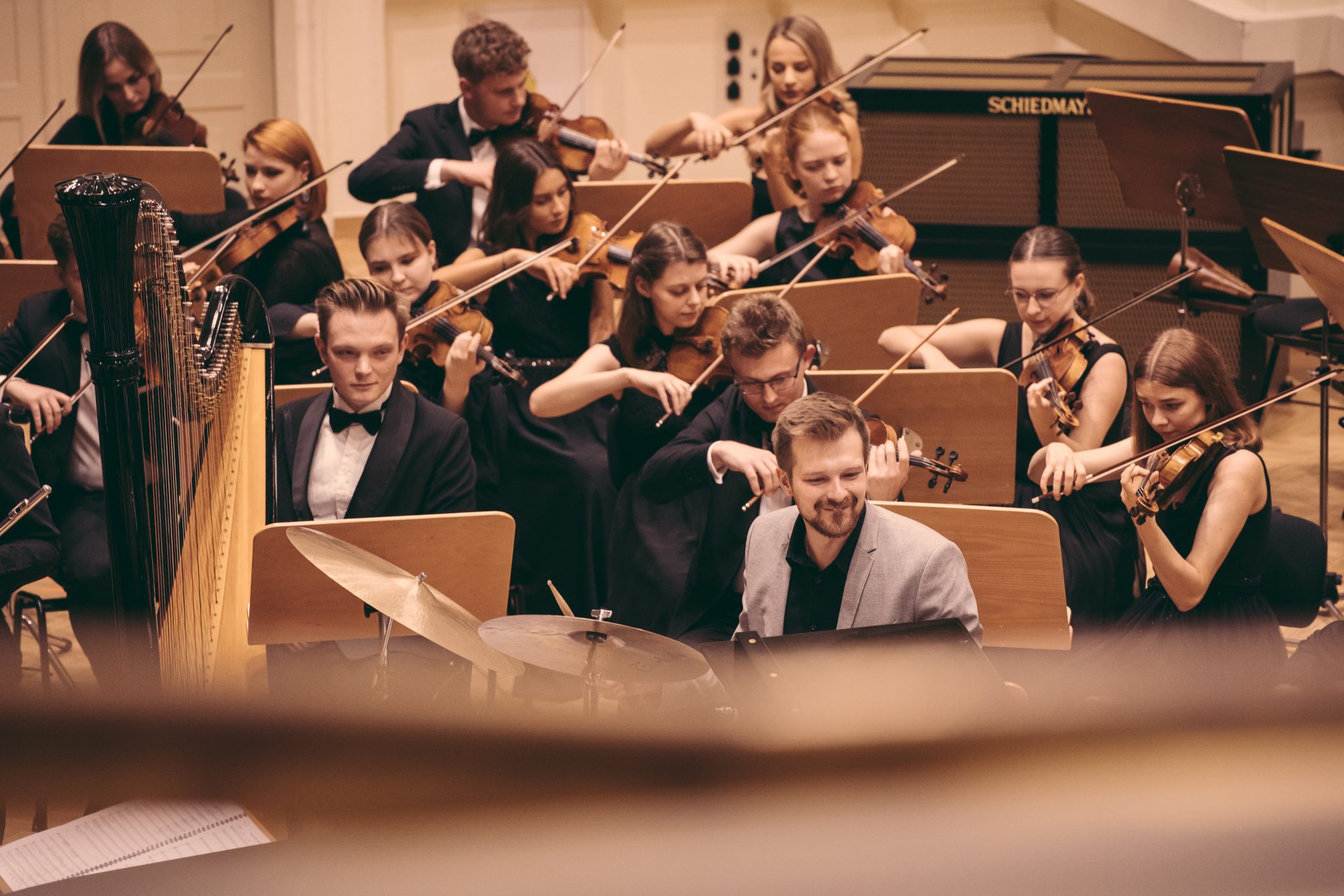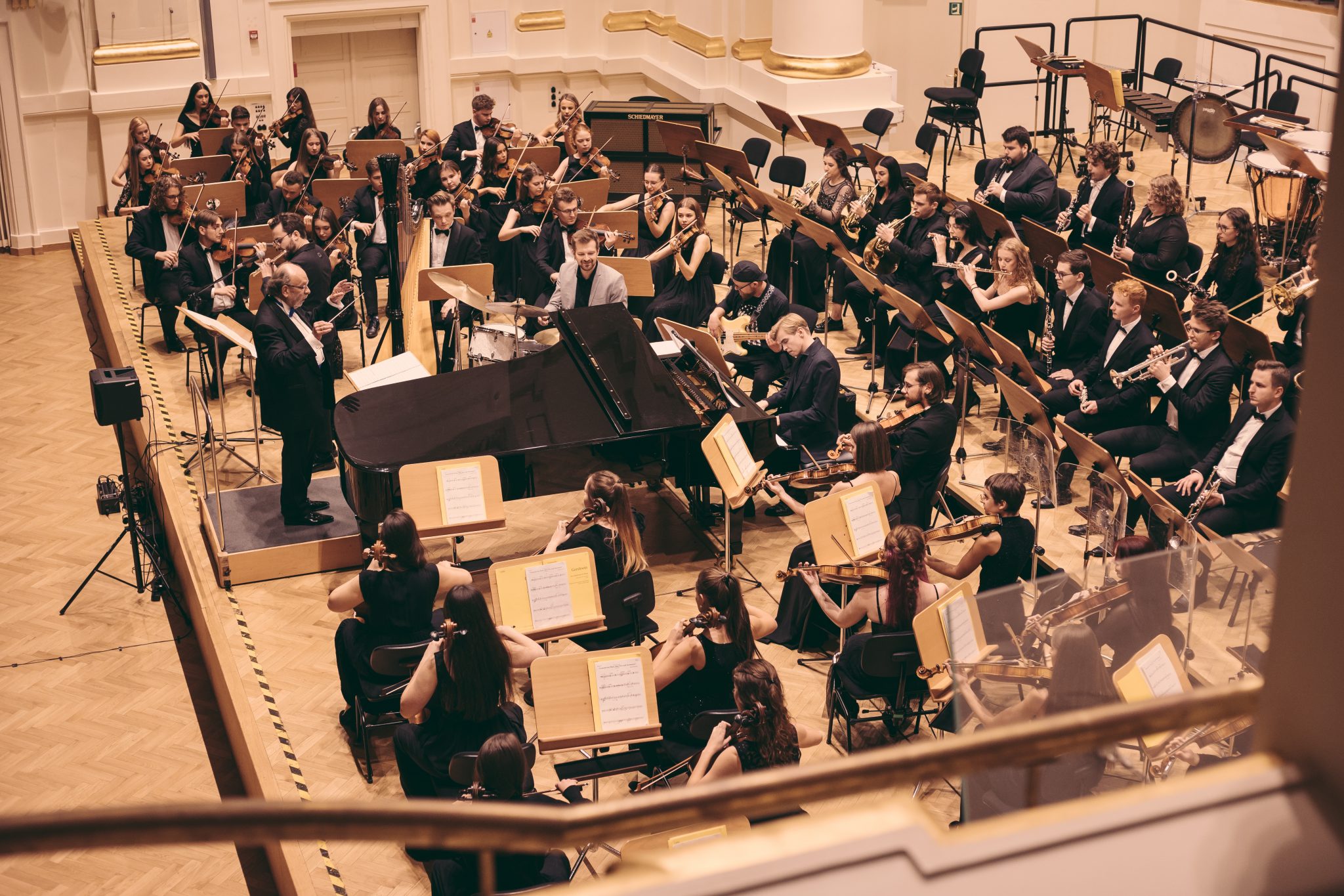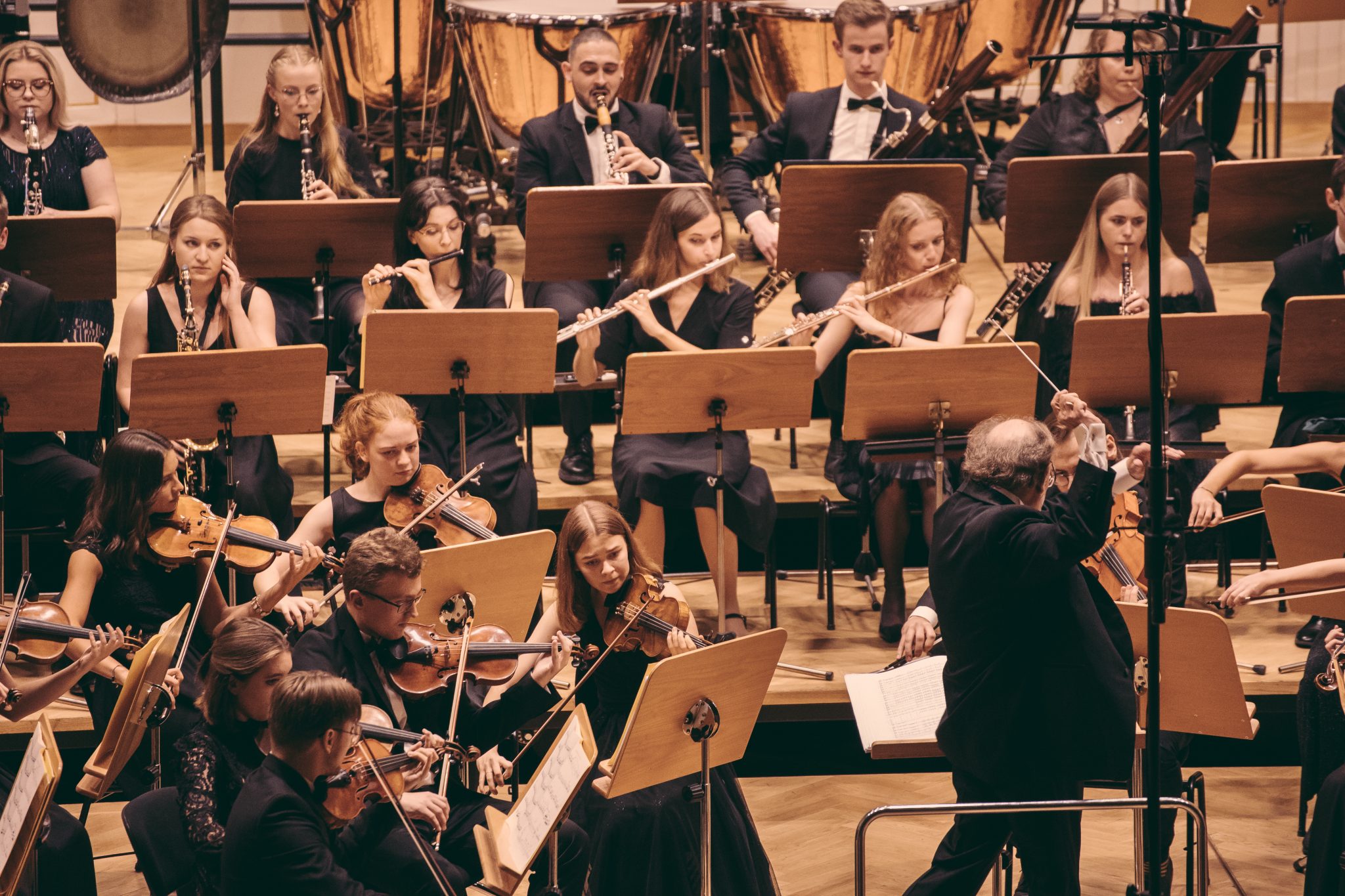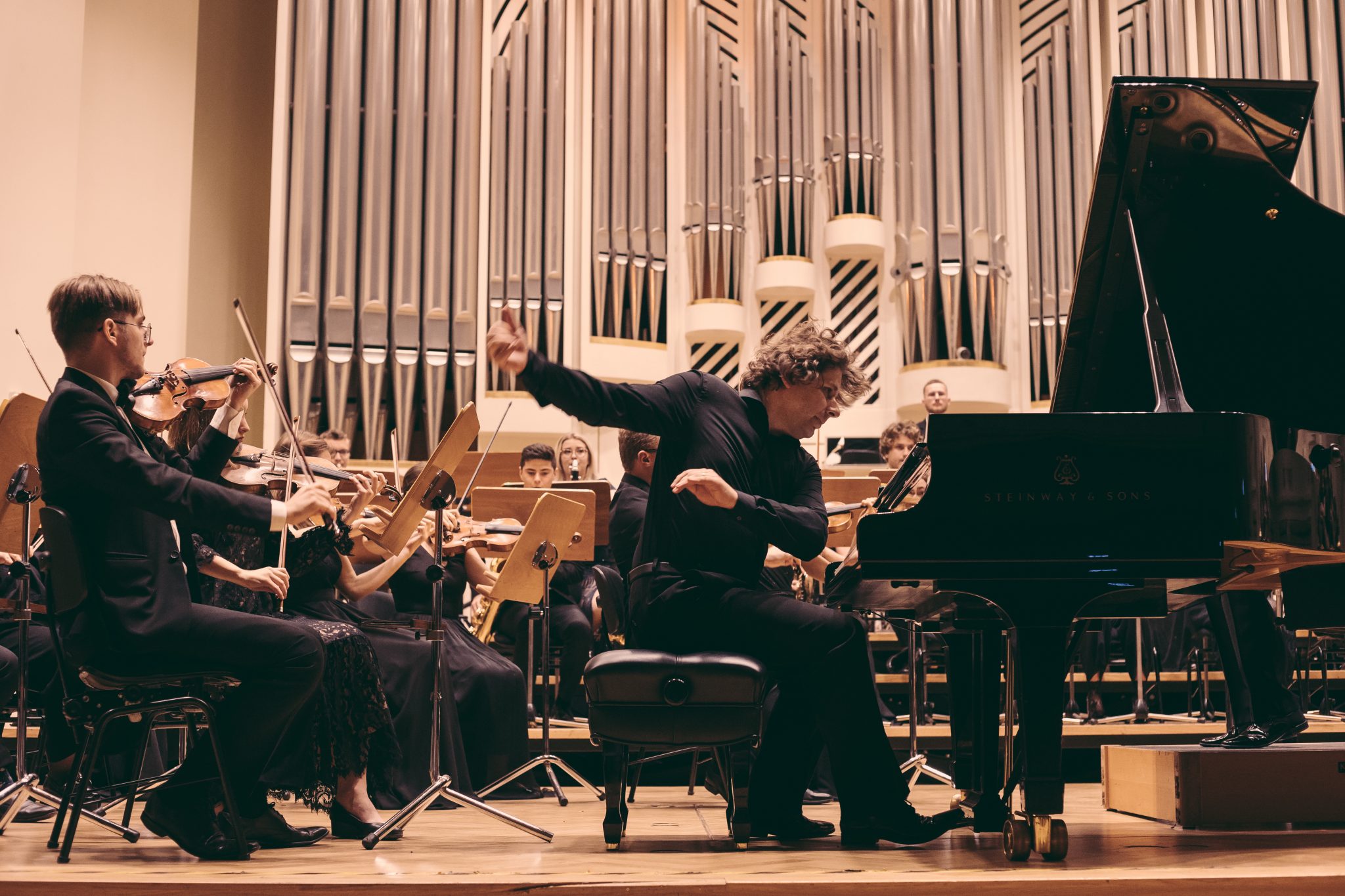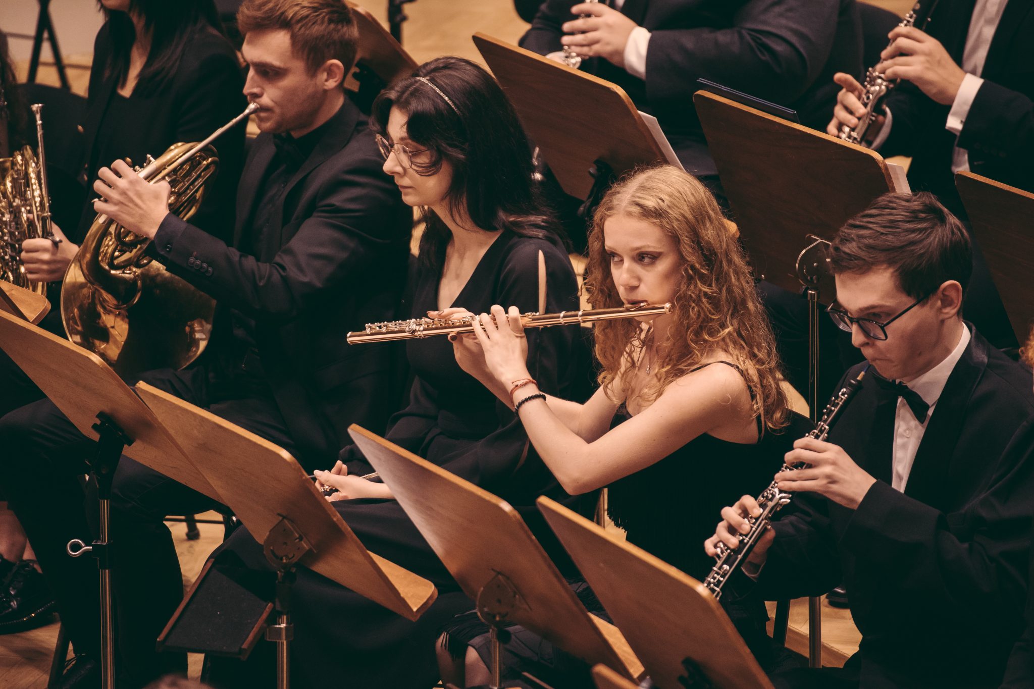 Koncert Orkiestry Symfonicznej w Filharmonii Krakowskiej pod dyrygenturą Rafała Jacka Delekty, z udziałem solistów – Łukasza Jankowskiego (flet) i Marka Szlezera (fortepian), fot. Piotr Markowski.