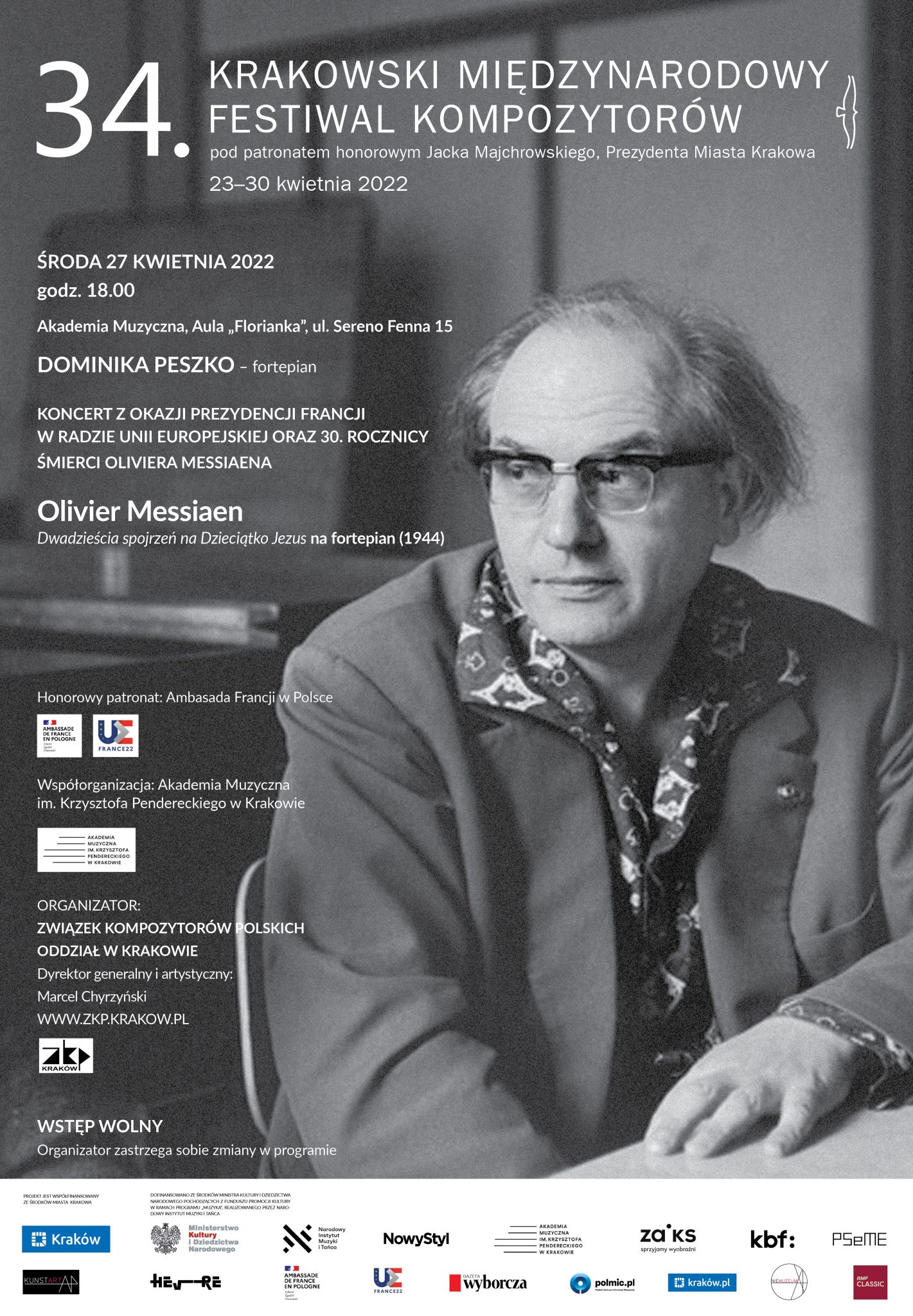 Ważnym wydarzeniem festiwalowym będzie także koncert z okazji Prezydencji Francji w Radzie Unii Europejskiej oraz 30. rocznicy śmierci Oliviera Messiaena. Znakomita krakowska pianistka Dominika Peszko wykona cały cykl Dwudziestu spojrzeń na Dzieciątko Jezus O. Messiaena. Do tej pory tylko dwóch polskich pianistów zagrało ten cykl w całości: Jerzy Godziszewski oraz Eugeniusz Knapik. Koncert odbędzie się pod honorowym patronatem Ambasady Francji w Polsce.