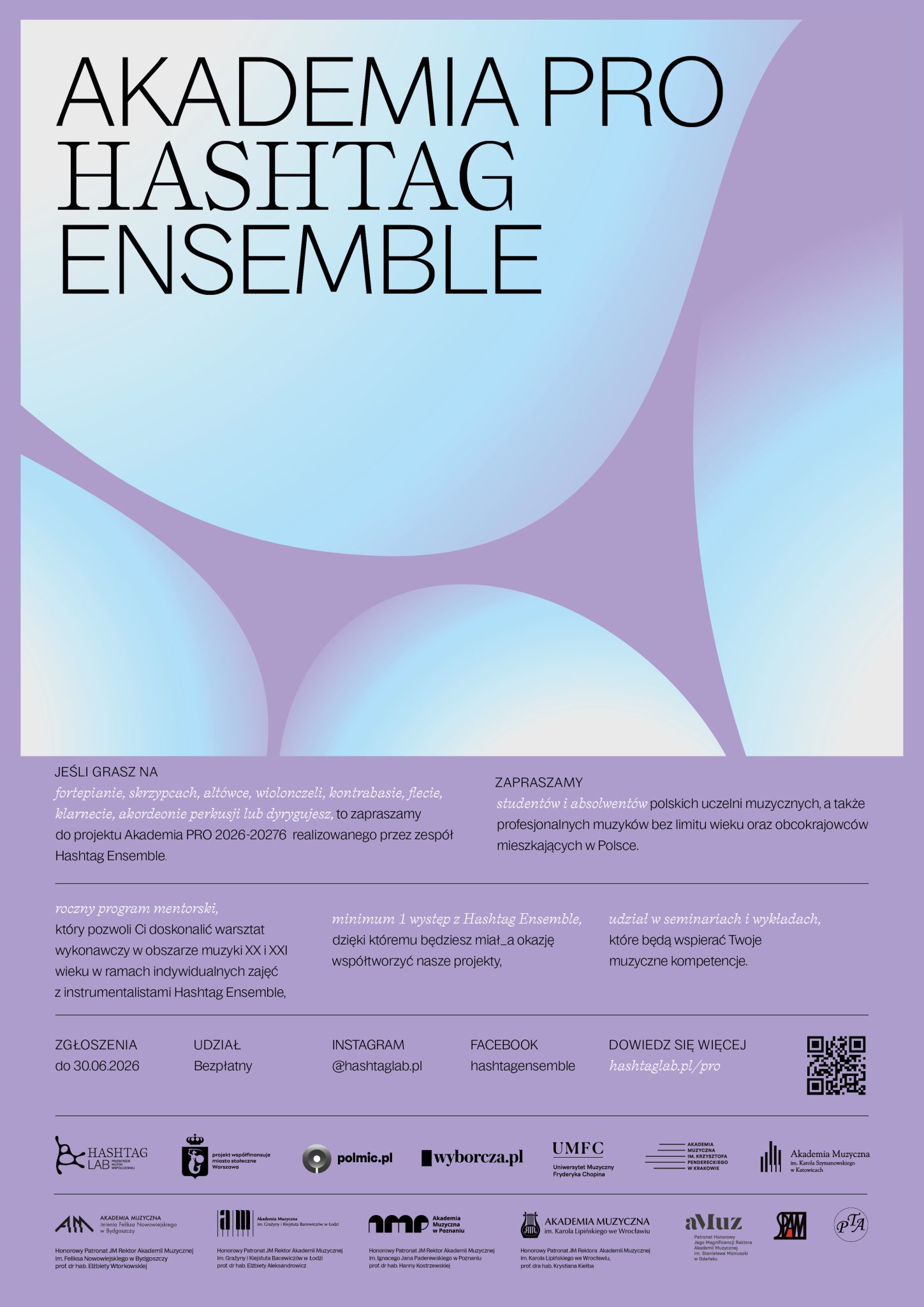 Zapraszamy do udziału w kolejnej edycji Akademii PRO – rocznego programu mentorskiego skierowanego do studentów, absolwentów uczelni muzycznych oraz profesjonalnych muzyków działających w Polsce, realizowanego przez Hashtag Ensemble. Program obejmuje instrumentalistów i dyrygentów, oferując unikalną możliwość pracy w środowisku muzyki współczesnej oraz bezpośredniej współpracy z jednym z najważniejszych zespołów muzyki nowej w Polsce.