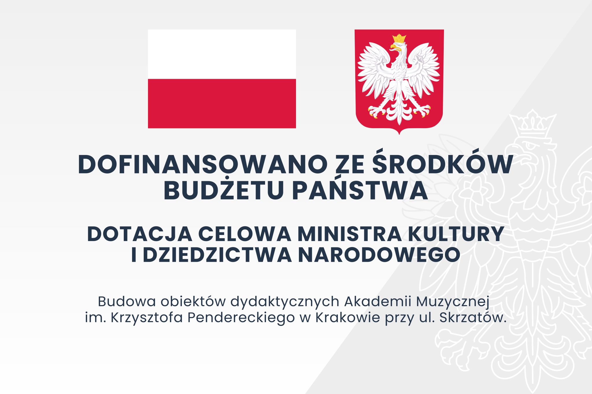 Dofinansowano ze środków Ministra Kultury i Dziedzictwa Narodowego. Dotacja celowa: Budowa obiektów dydaktycznych Akademii Muzycznej w Krakowie przy ul. Skrzatów.