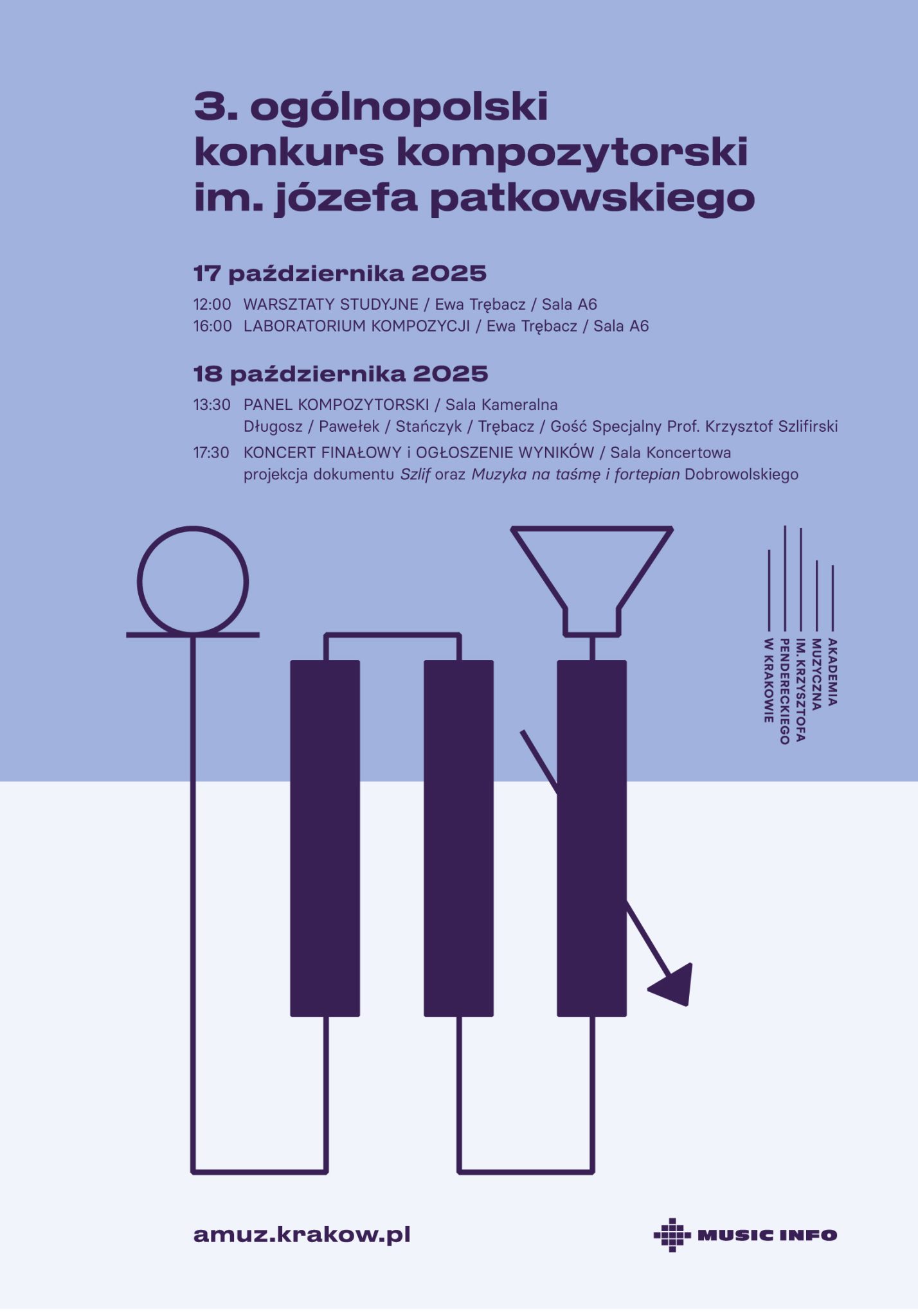 Katedra Kompozycji AMKP oraz Studio Muzyki Elektroakustycznej serdecznie zapraszają studentów wszystkich wydziałów naszej Akademii, pracowników dydaktycznych i naukowych oraz zainteresowanych Gości spoza naszej Uczelni do udziału w Finale 3. Ogólnopolskiego Konkursu Kompozytorskiego im. Józefa Patkowskiego, w dniach 17-18 października 2025.