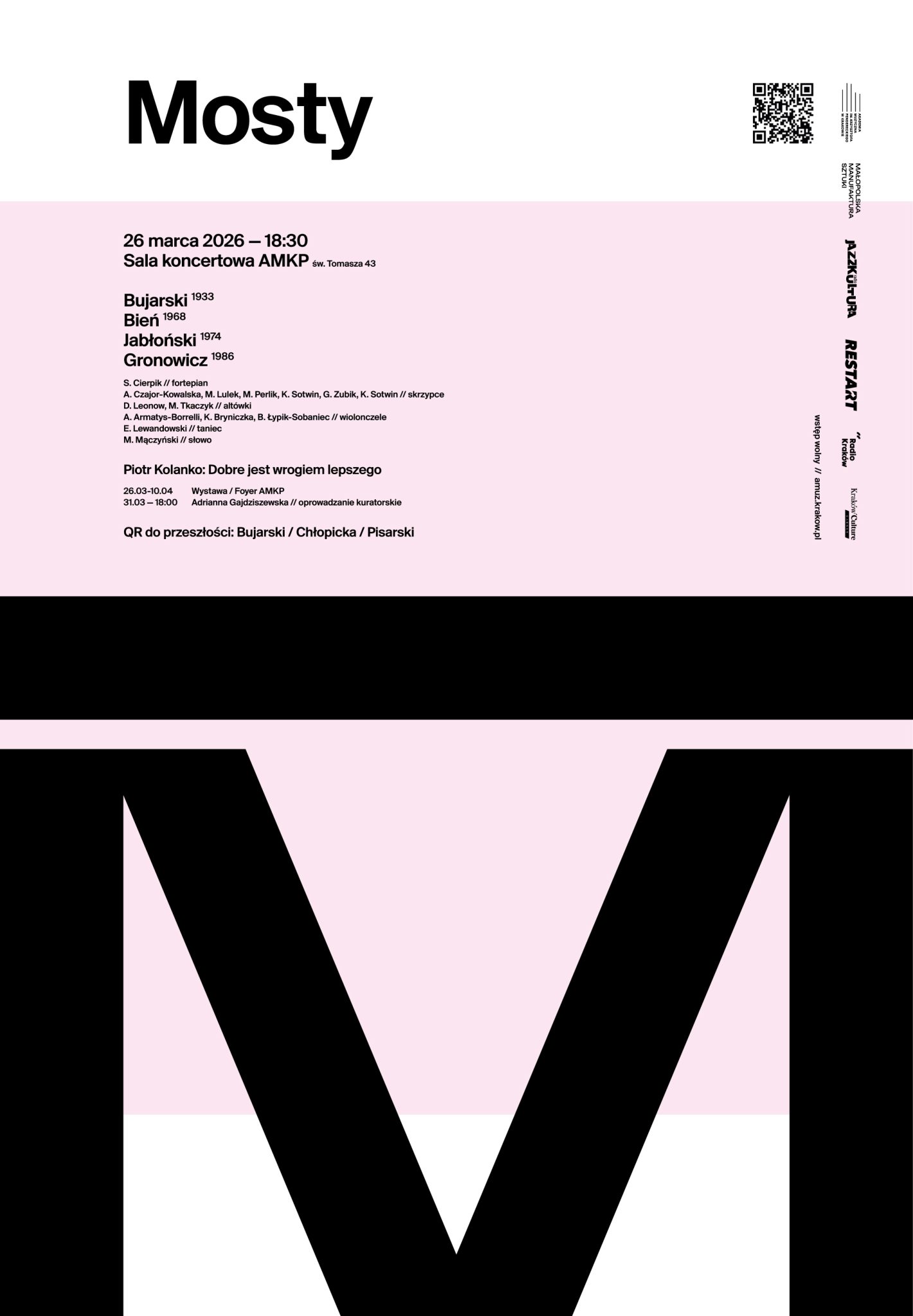 Tegoroczne MOSTY to także wystawa prac Piotra Kolanko – artysty wizualnego, którego ekspresyjne rysunki i obrazy balansują między intuicją, symbolem i współczesną wrażliwością. Jego prace stanowią wizualny komentarz do idei MOSTÓW – dialogu między sztukami, pokoleniami i sposobami opowiadania o świecie. Kuratorką wystawy jest Adrianna Gajdziszewska. Prace artysty można będzie oglądać od 26 marca do 10 kwietnia 2026 w foyer AMKP przy ulicy św. Tomasza 43. Organizatorzy zapraszają na oprowadzanie kuratorskie 31 marca o godz. 18:00.