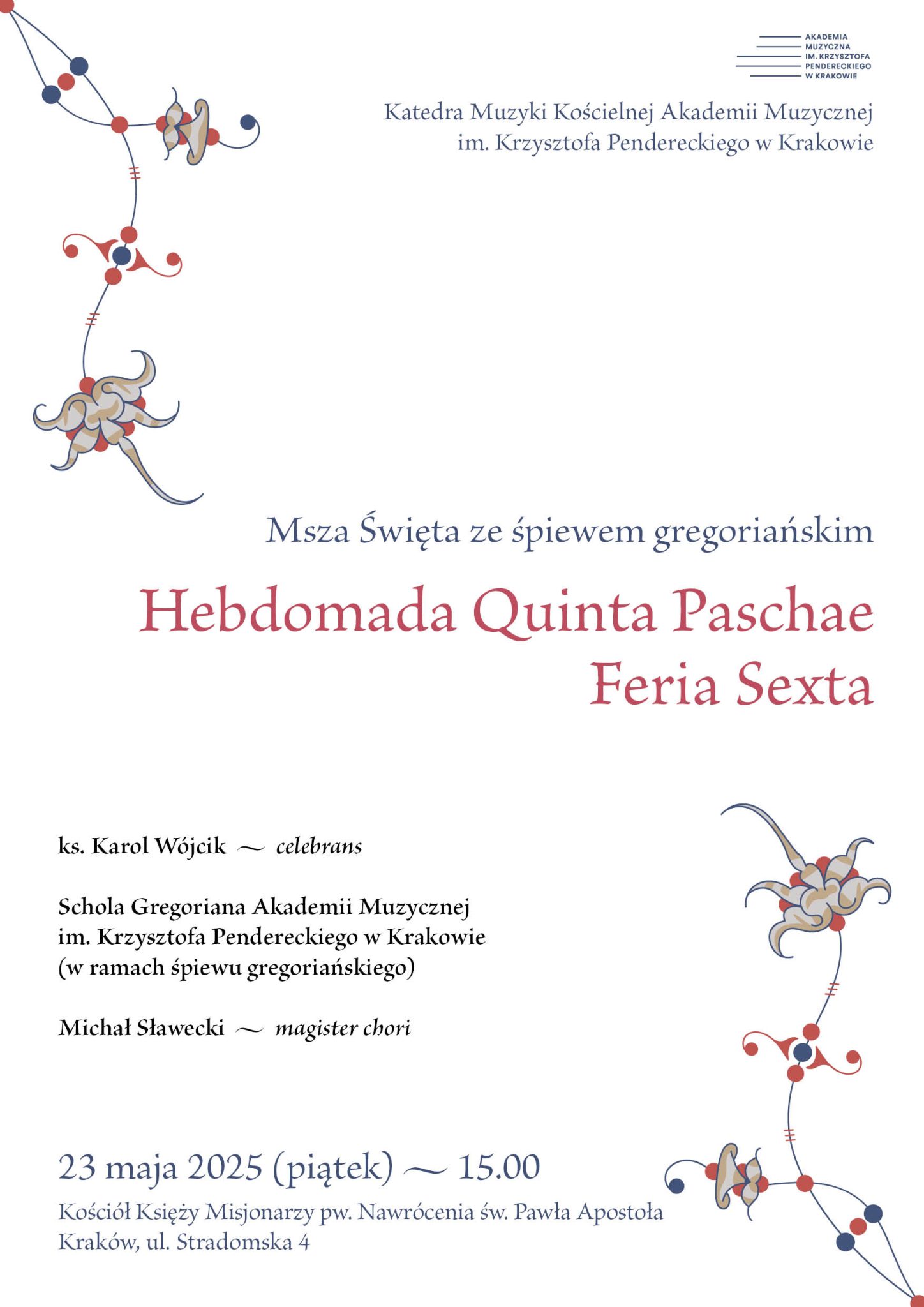 Katedra Muzyki Kościelnej zaprasza na Mszę świętą ze śpiewem gregoriańskim w wykonaniu Scholi Gregoriana AMKP. Magister chori, dyrygent – Michał Sławecki.