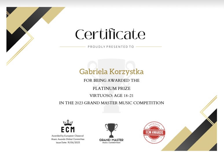 - Platinum Prize – vocal category – w Grand Master Music Competition – 19.06.2023 r.;