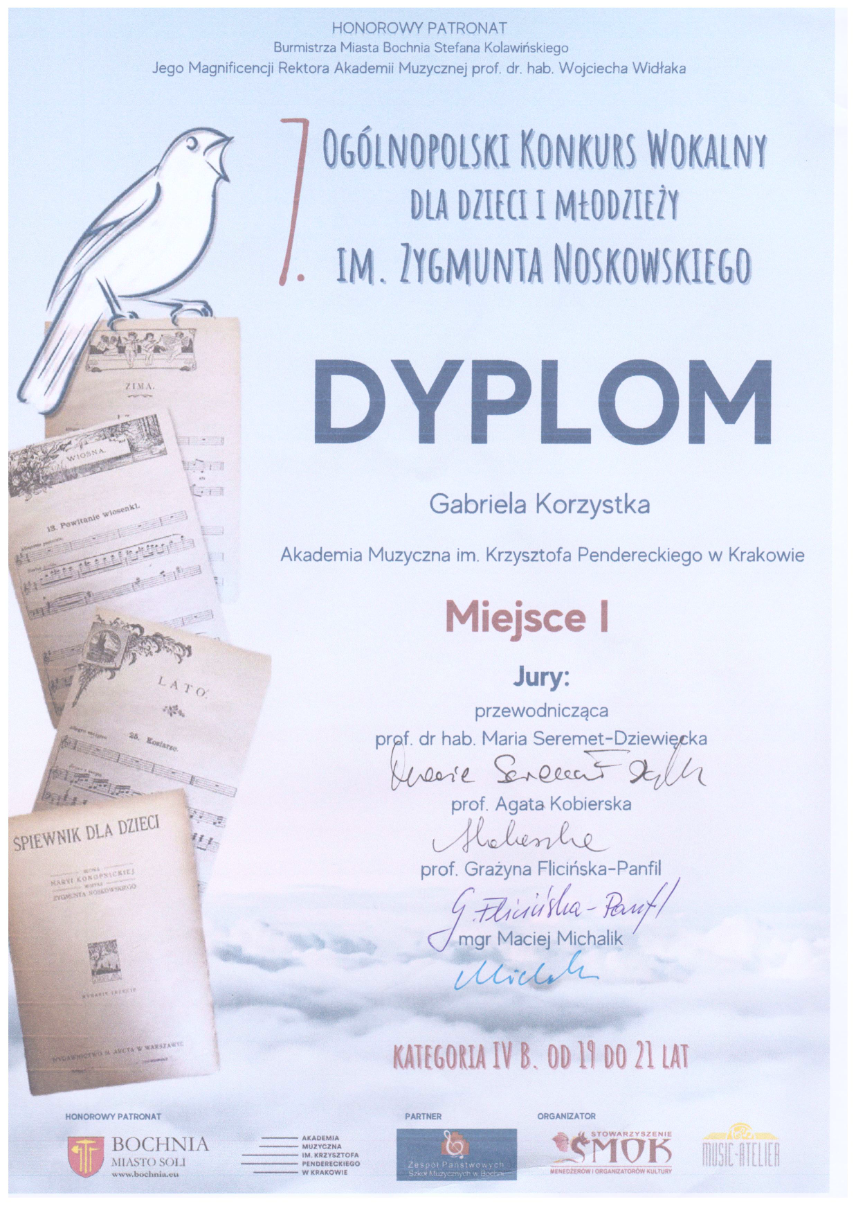 - I miejsce w 7. Ogólnopolskim Konkursie Wokalnym dla Dzieci i Młodzieży im. Zygmunta Noskowskiego w Bochni, 15.04.2023 r.