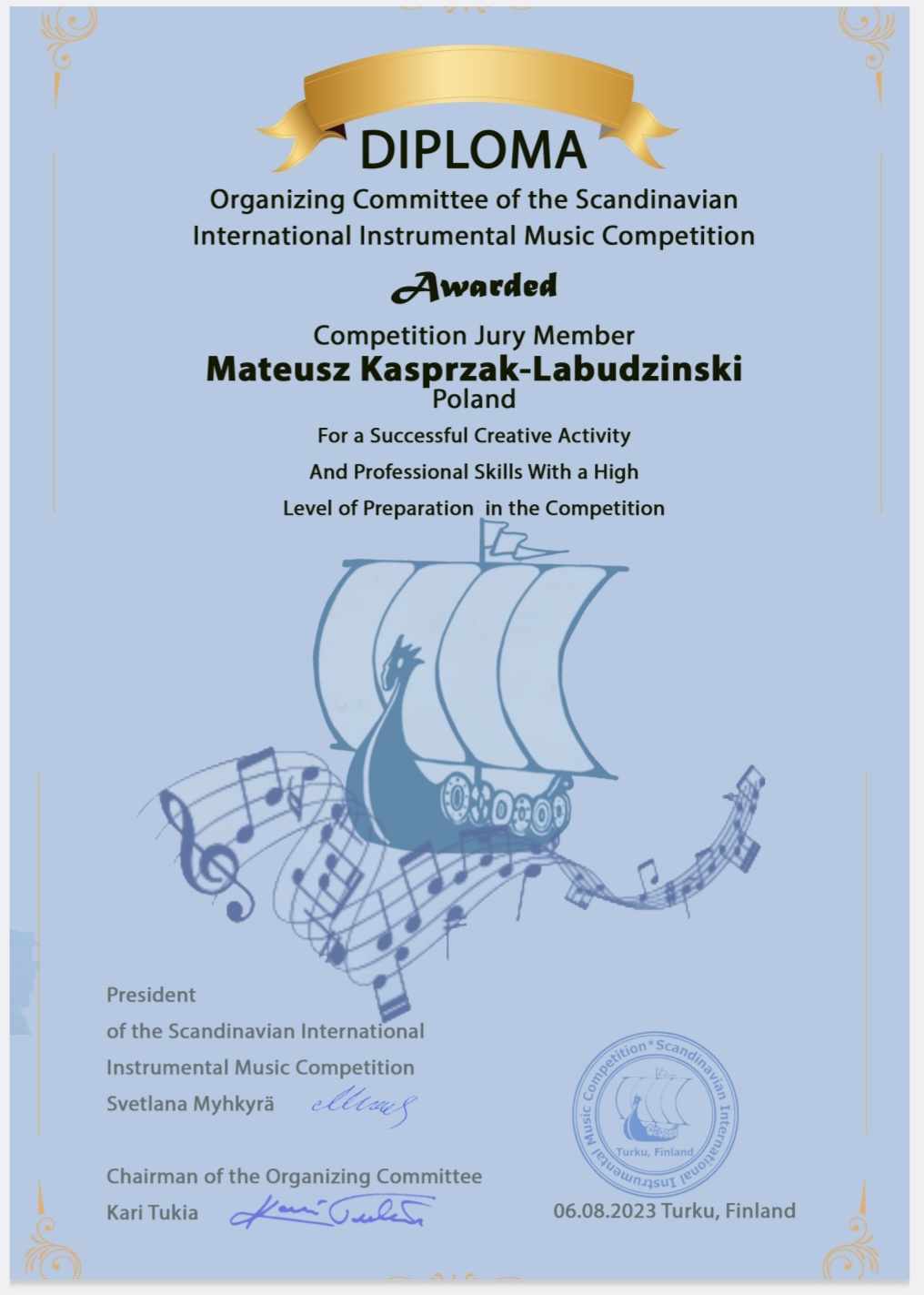 Mateusz Kasprzak-Łabudziński – juror konkursu – otrzymał nagrodę od Komitetu Organizacyjnego Skandynawskiego Międzynarodowego Konkursu Muzycznego w Turku (Finlandia), który odbył się w dniach 4-6.08.2023 r.