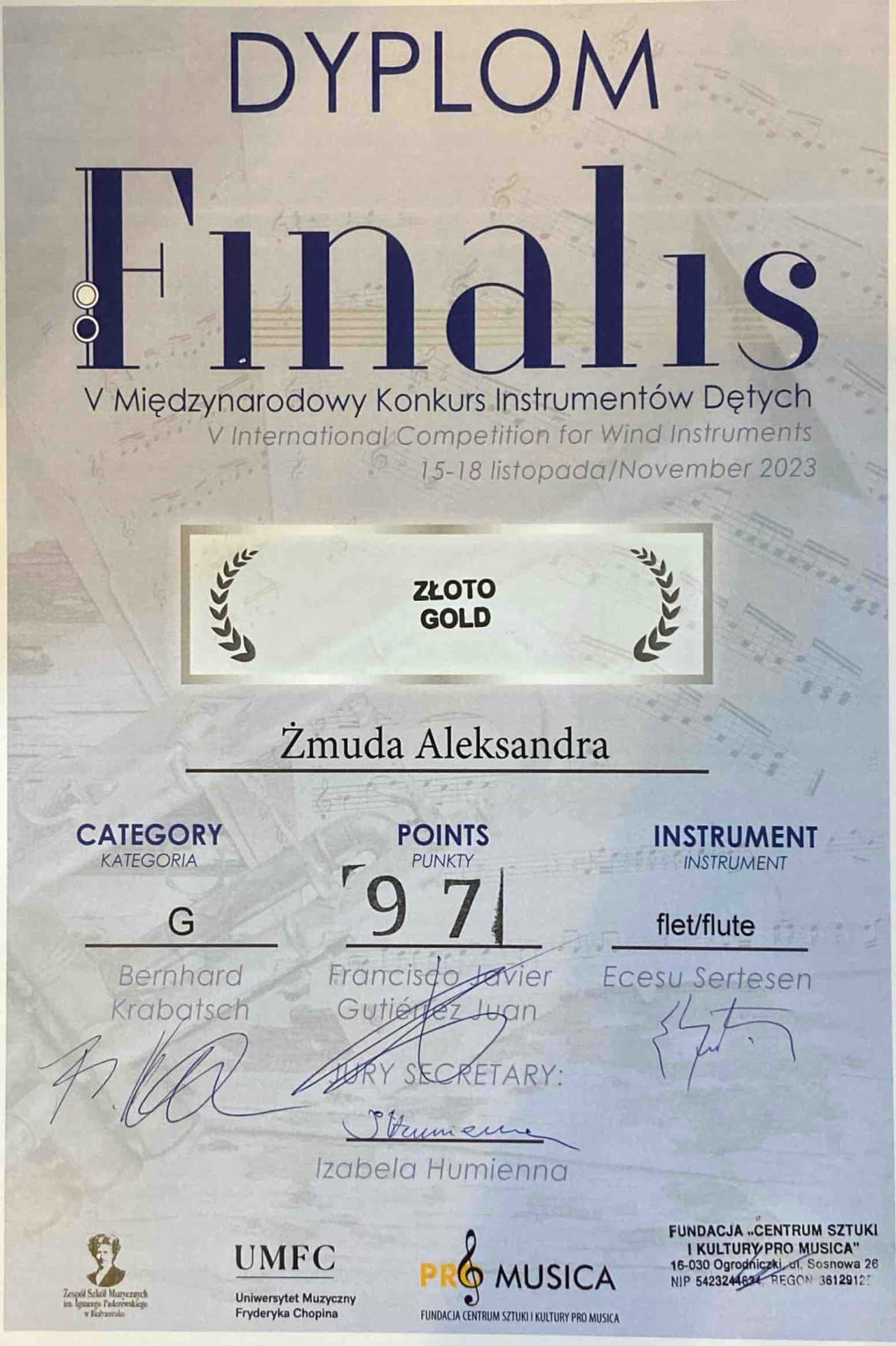 • Złotą NagrodęV Międzynarodowym Konkursie Instrumentów Dętych FINALIS, w dniach 15-18.11.2023 r. w Białymstoku,