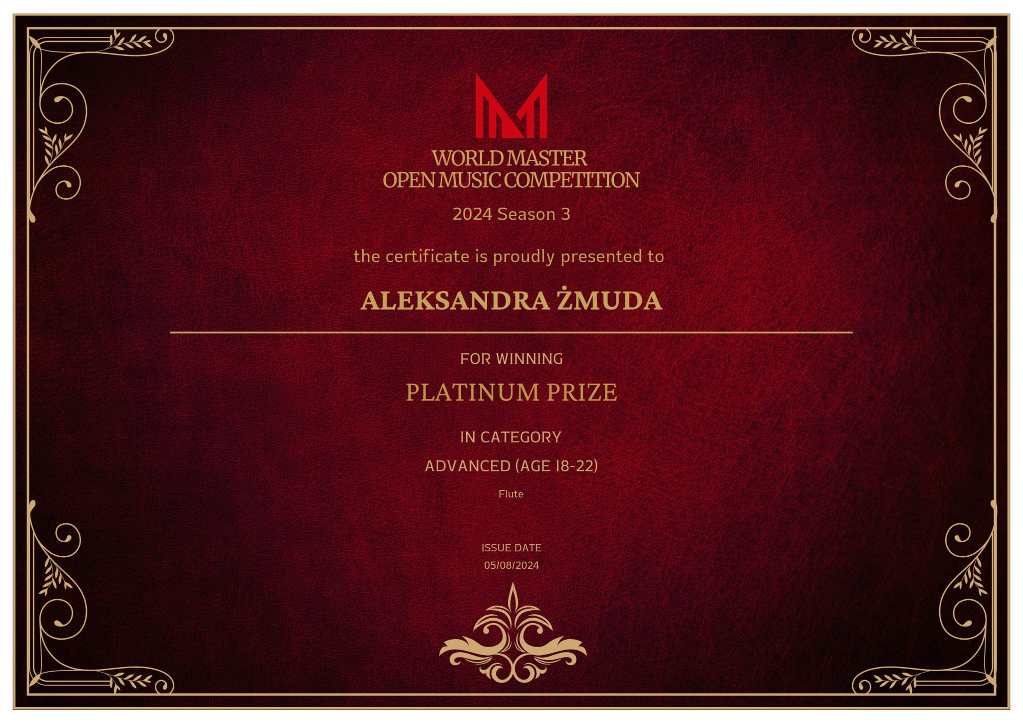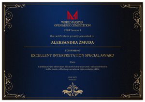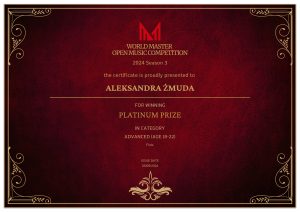 • Platynową nagrodę oraz nagrodę specjalną za wspaniałą interpretację utworu – Sonaty na flet i fortepian R. Muczynskiego – w World Master Open Music Competition.