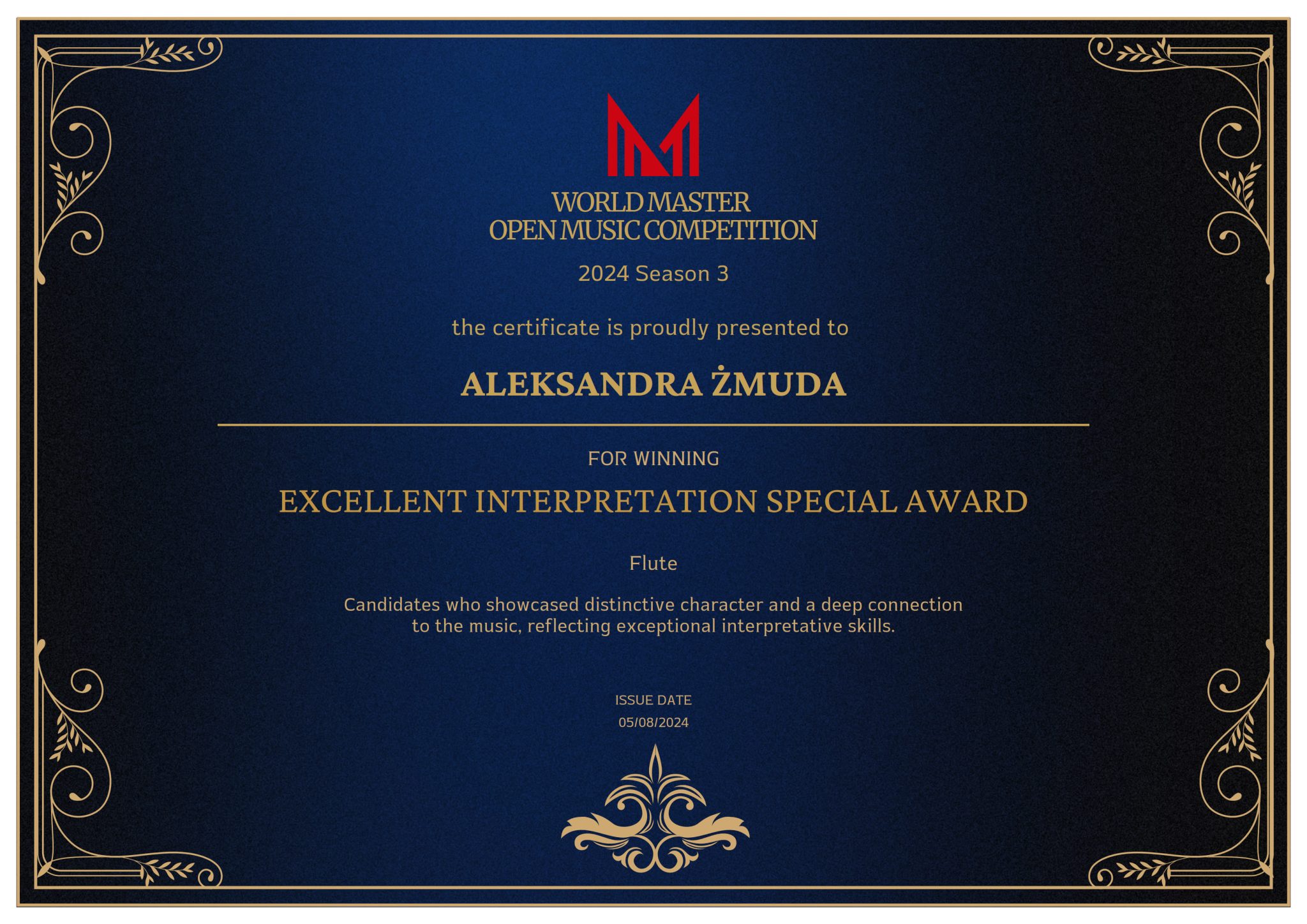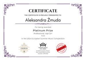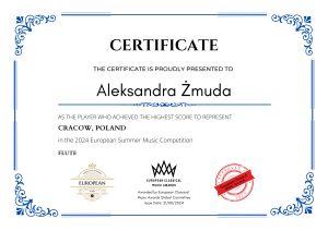Aleksandra Żmuda, studentka 3 roku studiów I stopnia w klasie fletu prof. dr h.c. Barbary Świątek Żelaznej w roku akademickim 2023/2024 zdobyła następujące nagrody: