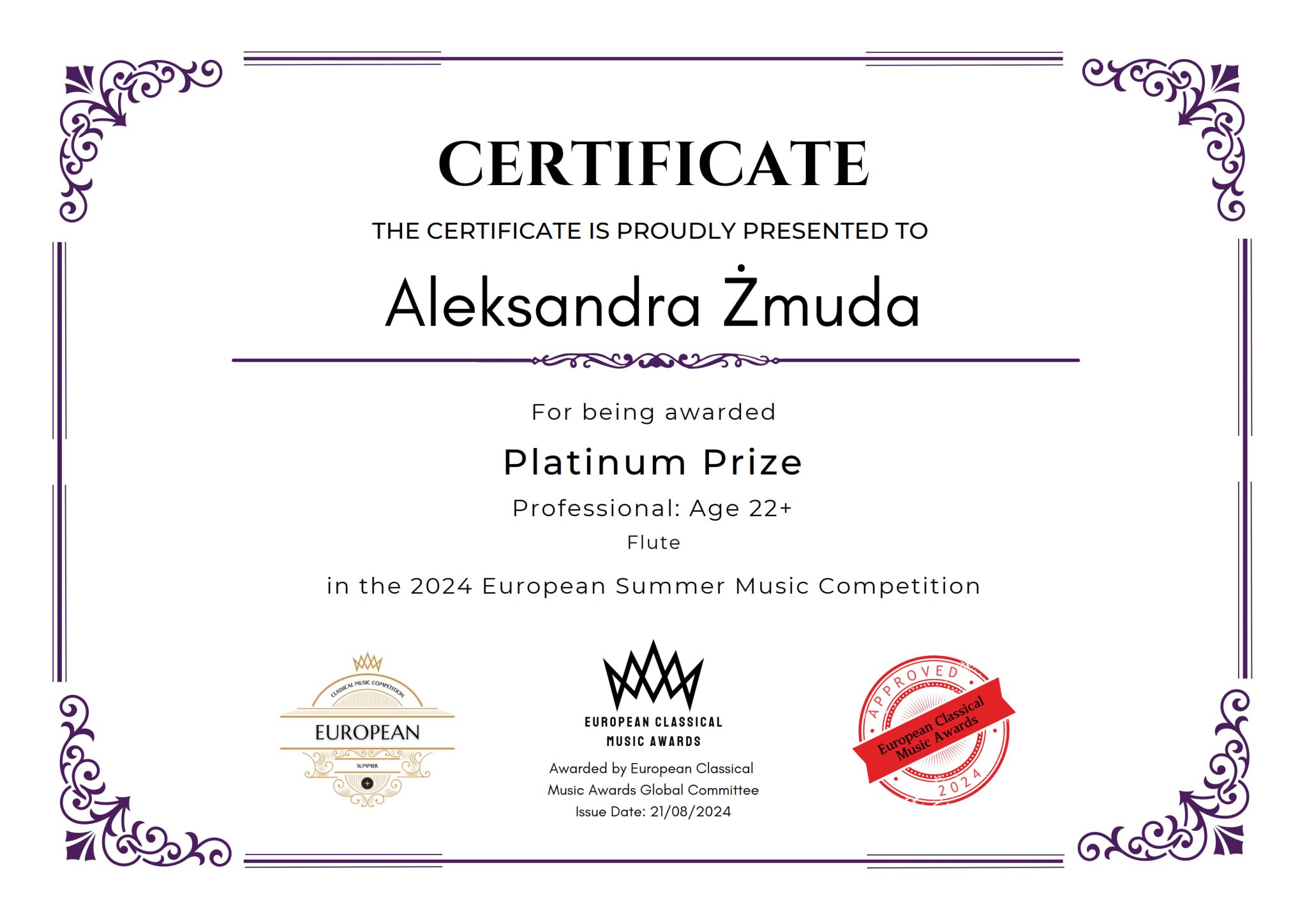 • Platynową nagrodę oraz nagrodę dla kandydata, który osiągnął najwyższy wynik w reprezentowaniu Karkowa w 2024 European Summer Music Competition,