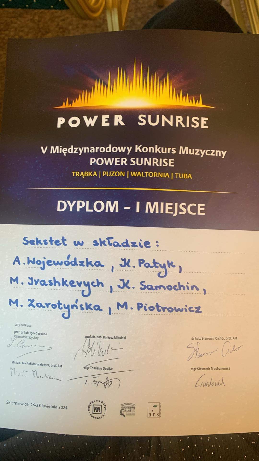 • 1 miejsce w 5. Międzynarodowym Konkursie Muzycznym POWER SUNRISE, w dniach 26-28.04.2024 r.
