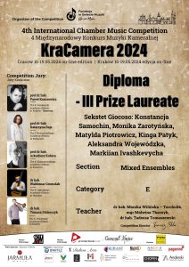 • 3 miejsce w 4. Międzynarodowym Konkursie Muzyki Kameralnej KraCamera, w dniach 16-19.05.2024 r.