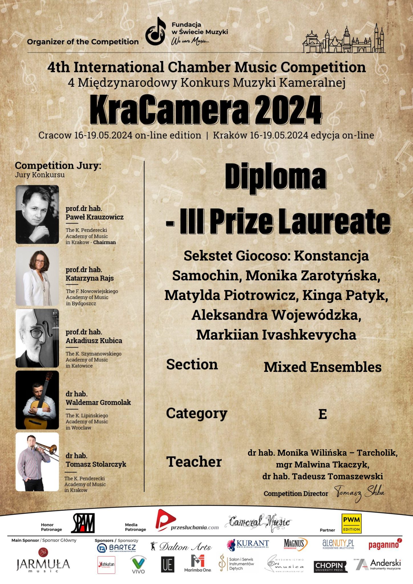 Sekstet Giocoso w składzie: Konstancja Samochin (skrzypce), Monika Zarotyńska (altówka), Matylda Piotrowicz (wiolonczela), Kinga Patyk (klarnet), Aleksandra Wojewódzka (waltornia) i Markiian Ivashkevych (fortepian), z klasy dr hab. Moniki Wilińskiej-Tarcholik, mgr Malwiny Tkaczyk i dra hab. Tadeusza Tomaszewskiego, zdobył następujące nagrody: