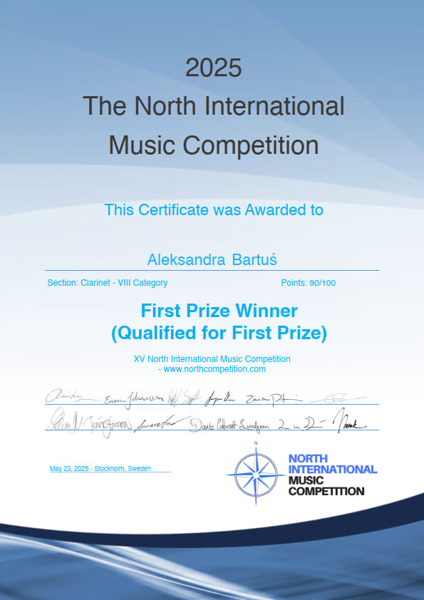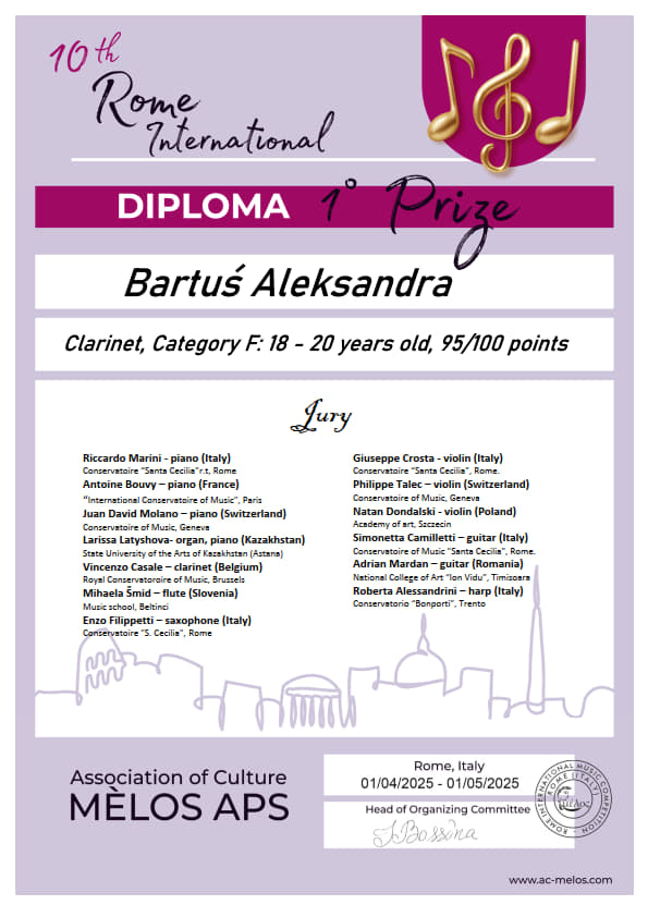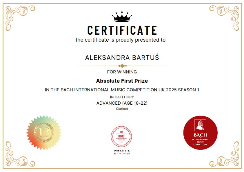 Aleksandra Bartuś, studentka II roku studiów licencjackich w klasie klarnetu prof. dra hab. Piotra Lato, zdobyła w roku akademickim 2024/2025 następujące osiągnięcia: