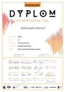 - wyróżnienie I st. w Ogólnopolskim Konkursie Instrumentalnym Rezonans, 2025