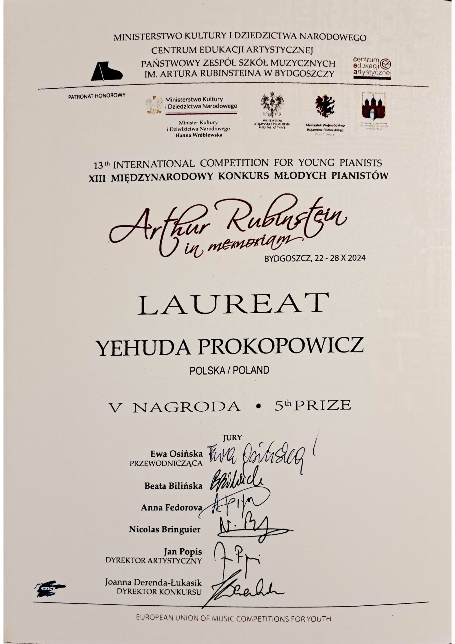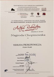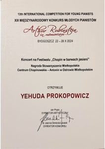 Yehuda Prokopowicz, student I roku studiów licencjackich z klasy fortepianu ad. dr. Krzysztofa Książka zdobył:
