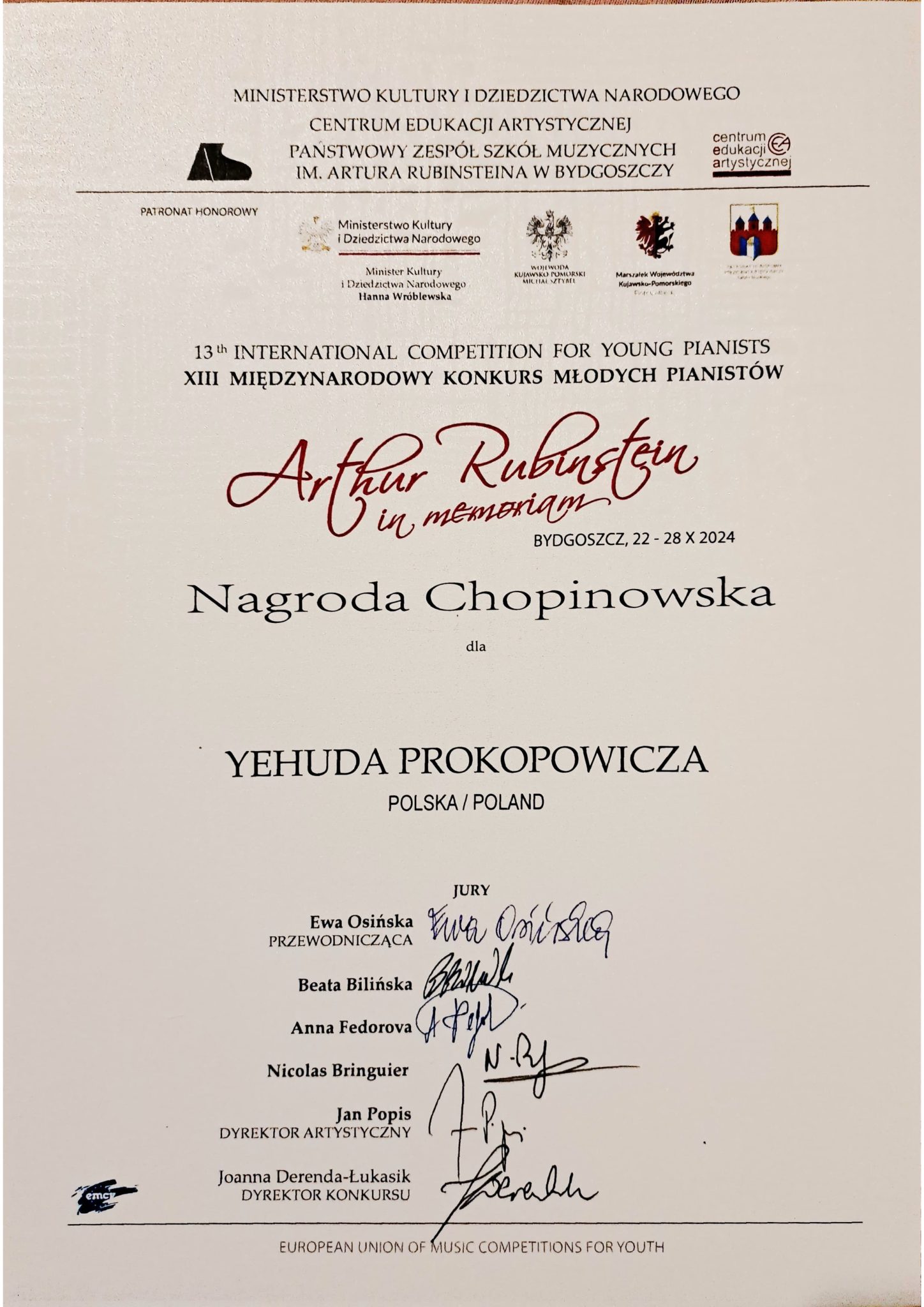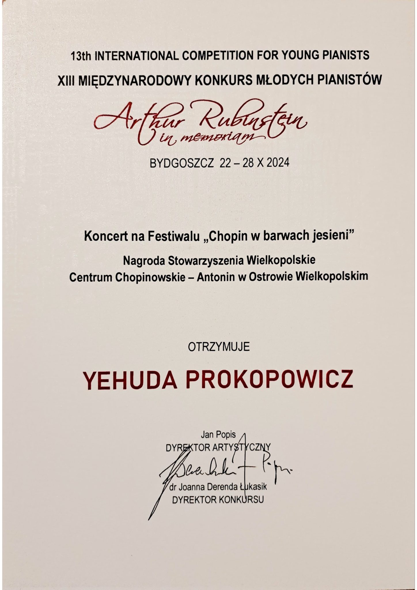 - Nagrodę Chopinowską, V nagrodę oraz nagrodę Stowarzyszenia Wielkopolskie Centrum Chopinowskie – Antonin w Ostrowie Wielkopolskim w postaci koncertu na Festiwalu „Chopin w barwach jesieni” na XIII Międzynarodowym Konkursie Młodych Pianistów „Arthur Rubinstein in memoriam” w Bydgoszczy, który odbył się w dniach 22-28 października 2024 r.