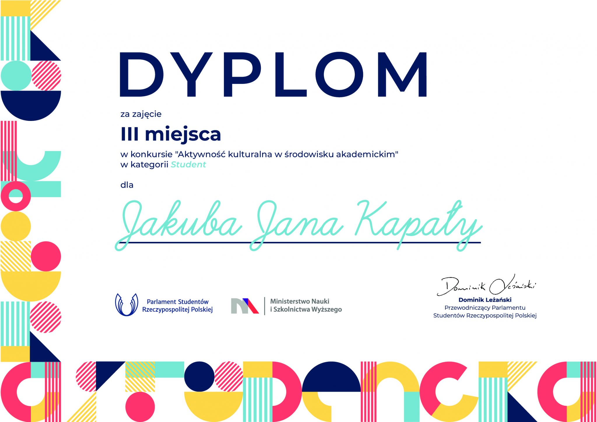 - III nagrodę w kategorii Student w konkursie Aktywność Kulturalna w Środowisku Akademickim, Warszawa 2020.