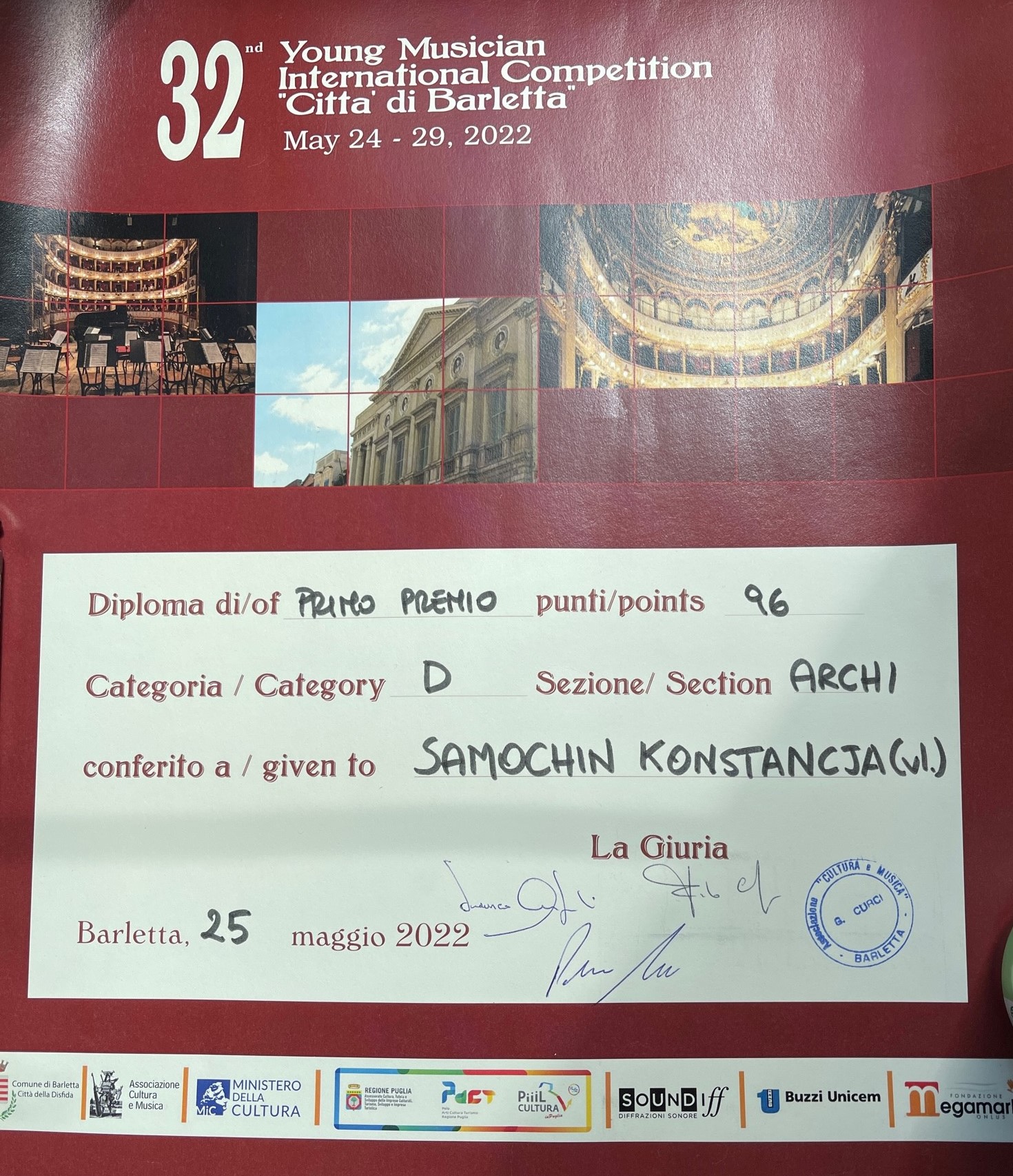 Konstancja Samochin, studentka drugiego roku studiów pierwszego stopnia z klasy skrzypiec prof. Mieczysława Szlezera, zdobyła I nagrodę Międzynarodowego Konkursu 32nd Young Musician International Competition „Città di Barletta”, w Barletta we Włoszech – 25.05.2022 r.