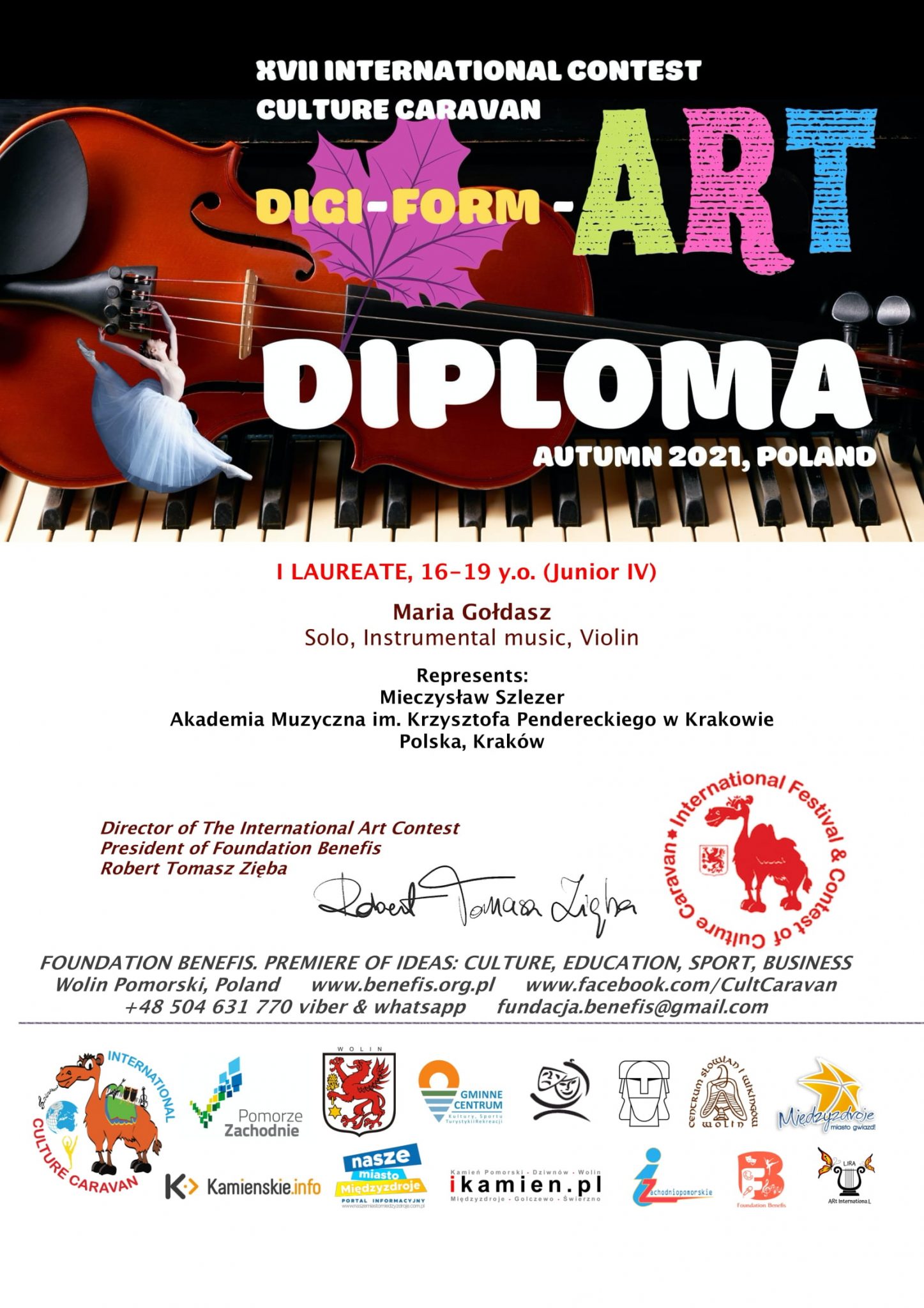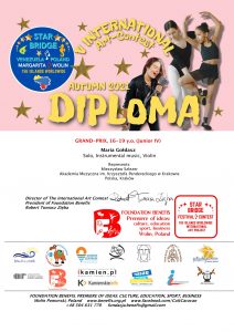Maria Gołdasz, studentka pierwszego roku studiów pierwszego stopnia z klasy skrzypiec prof. Mieczysława Szlezera zdobyła nagrody w Międzynarodowych Konkursach, w kategorii muzyka instrumentalna – solo: