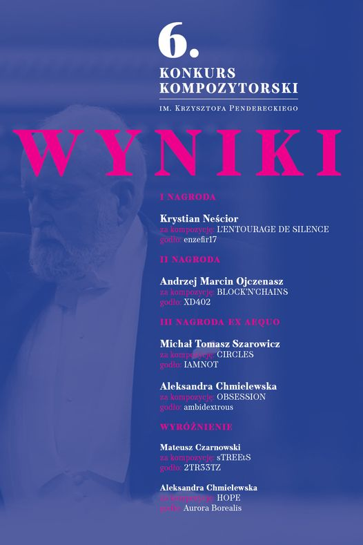Student III roku studiów pierwszego stopnia z klasy kompozycji prof. dra hab. Marcela Chyrzyńskiego oraz I roku studiów pierwszego stopnia kierunku edukacja artystyczna w zakresie sztuki muzycznej z klasy dyrygowania dr Joanny Wójtowicz otrzymał II nagrodę w 6. Konkursie Kompozytorskim im. Krzysztofa Pendereckiego w Sopocie, 23 maja 2021 r. za kompozycję BLOCK’N’CHAINS na orkiestrę smyczkową.