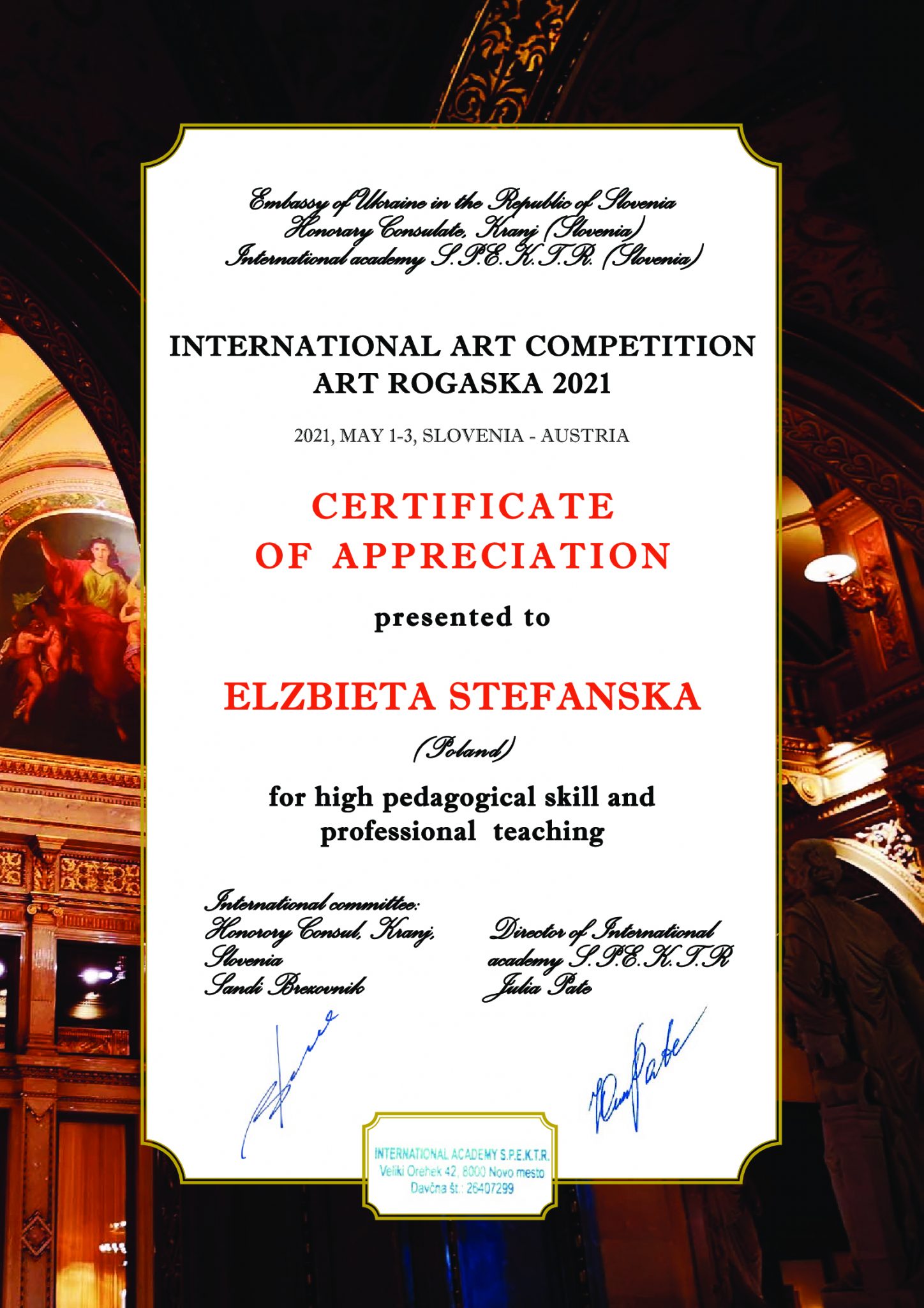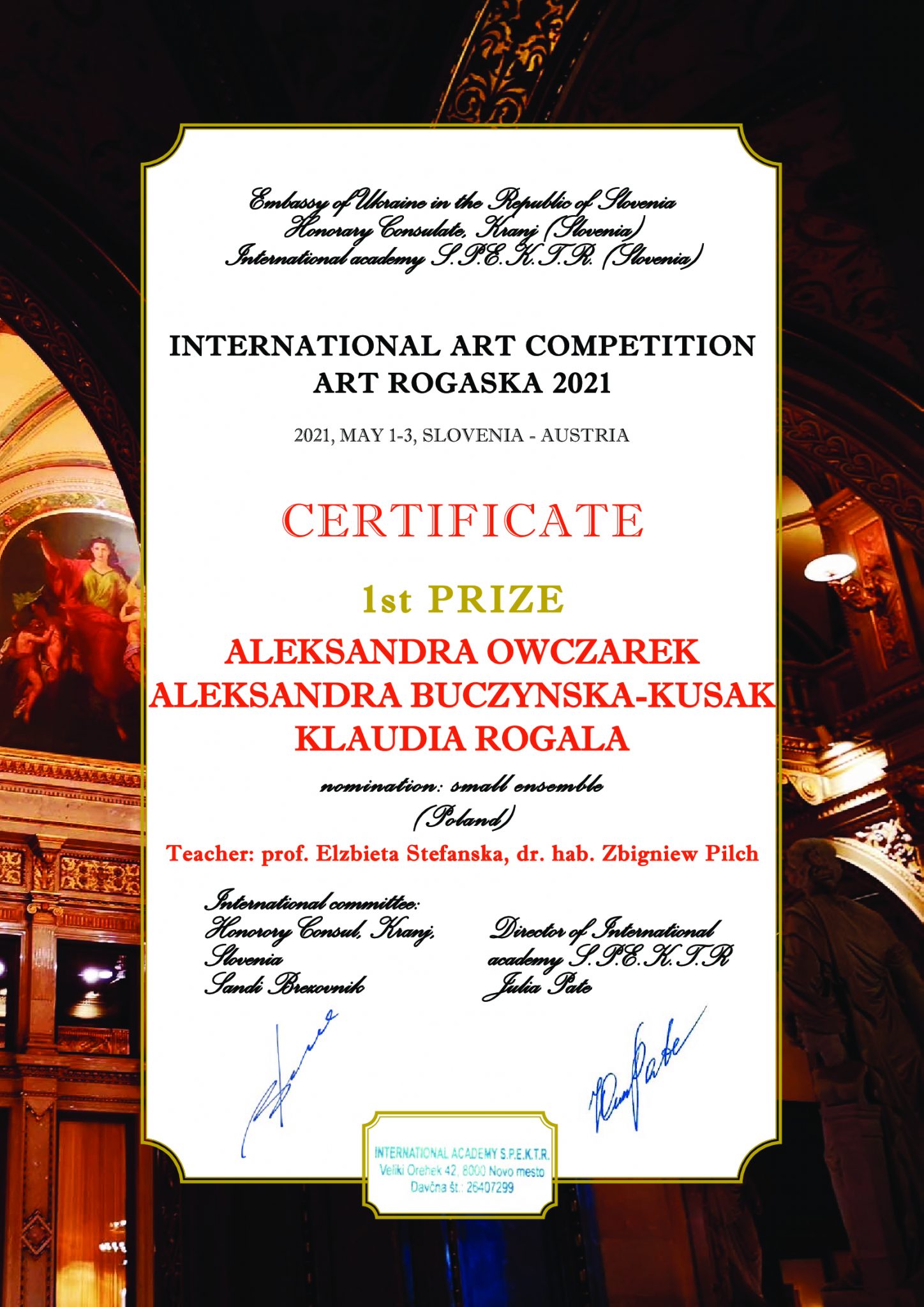 zdobyły I Nagrodę w kategorii zespołów kameralnych, w Międzynarodowym Konkursie Artystycznym International Art Competition ART ROGASKA 2021, w Słowenii – Austrii,
