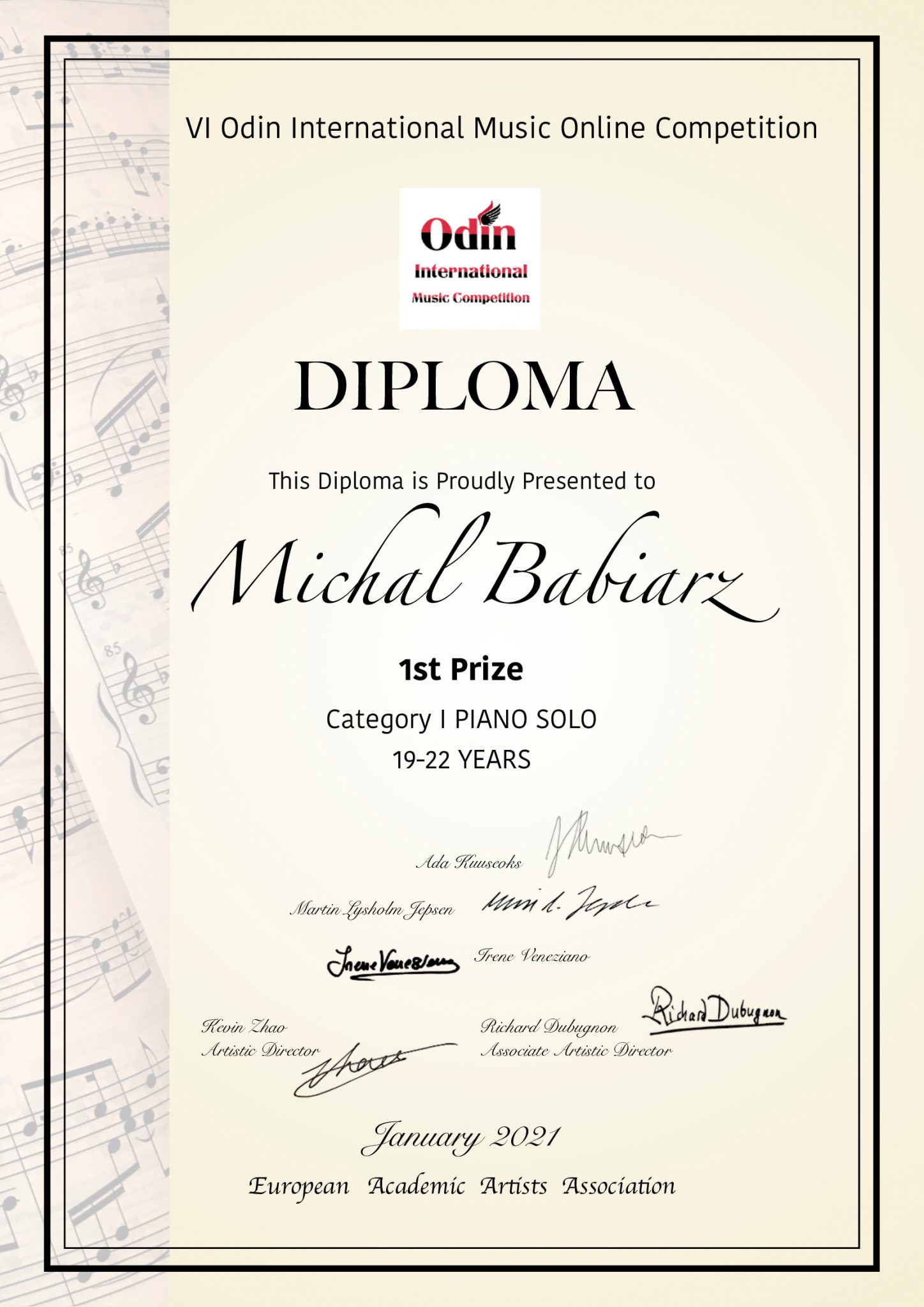 - VI ODIN International Online Music Competition, w styczniu 2021 – I Nagroda oraz Nagroda Specjalna w postaci koncertu w Chinach