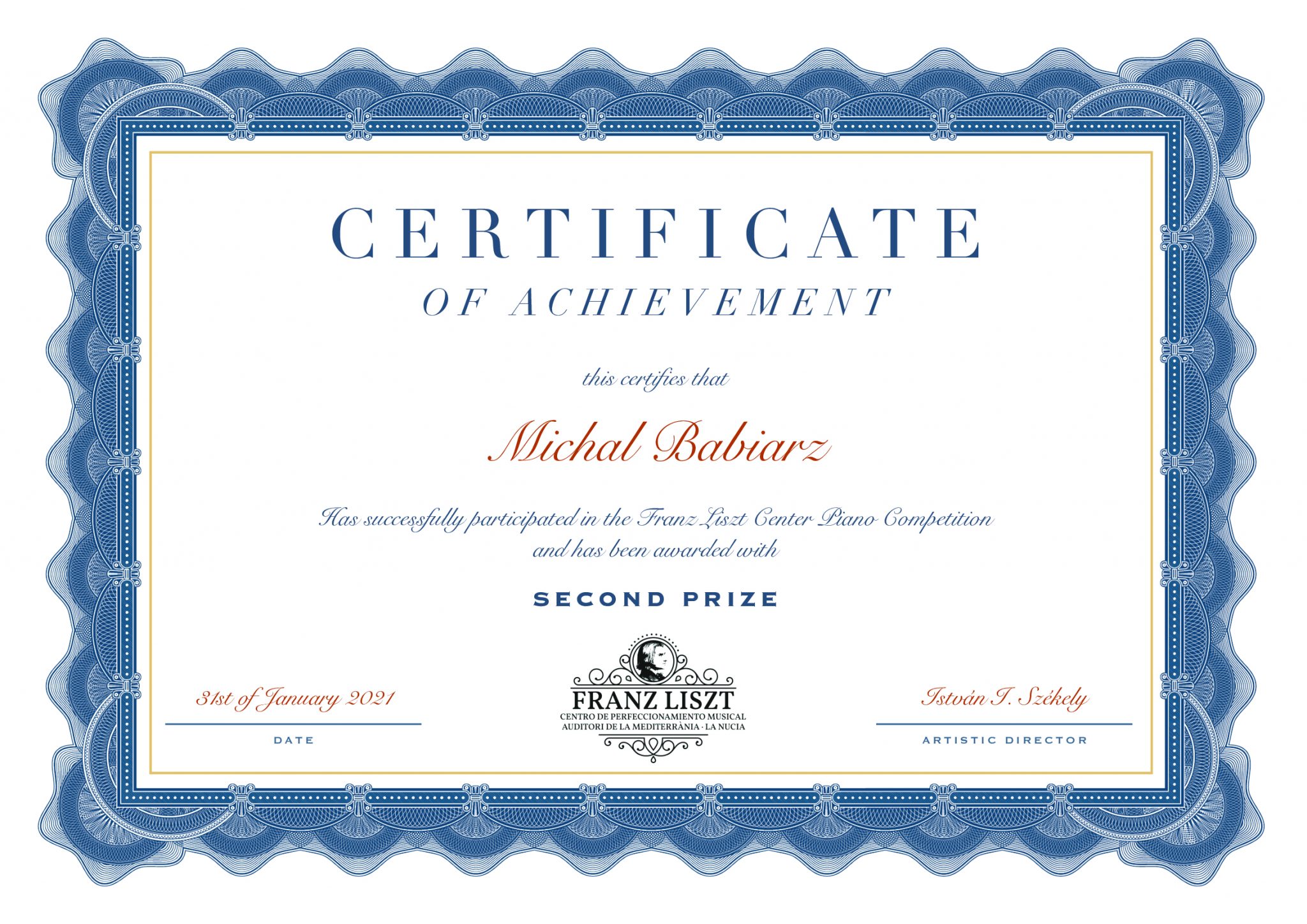 - Franz Liszt Centre International Piano Competition, w styczniu 2021 – II Nagroda