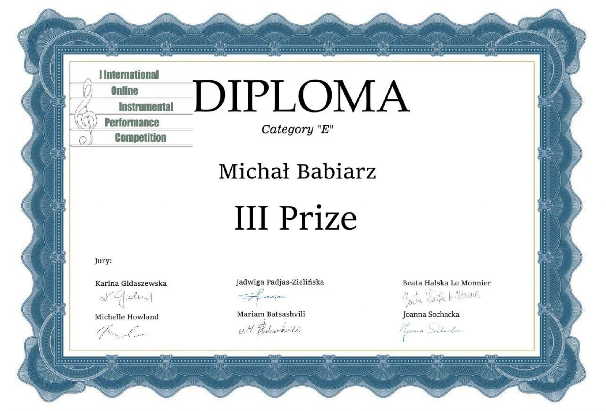 - I International Online Instrumental Performance Competition, w marcu 2021 – III Nagroda