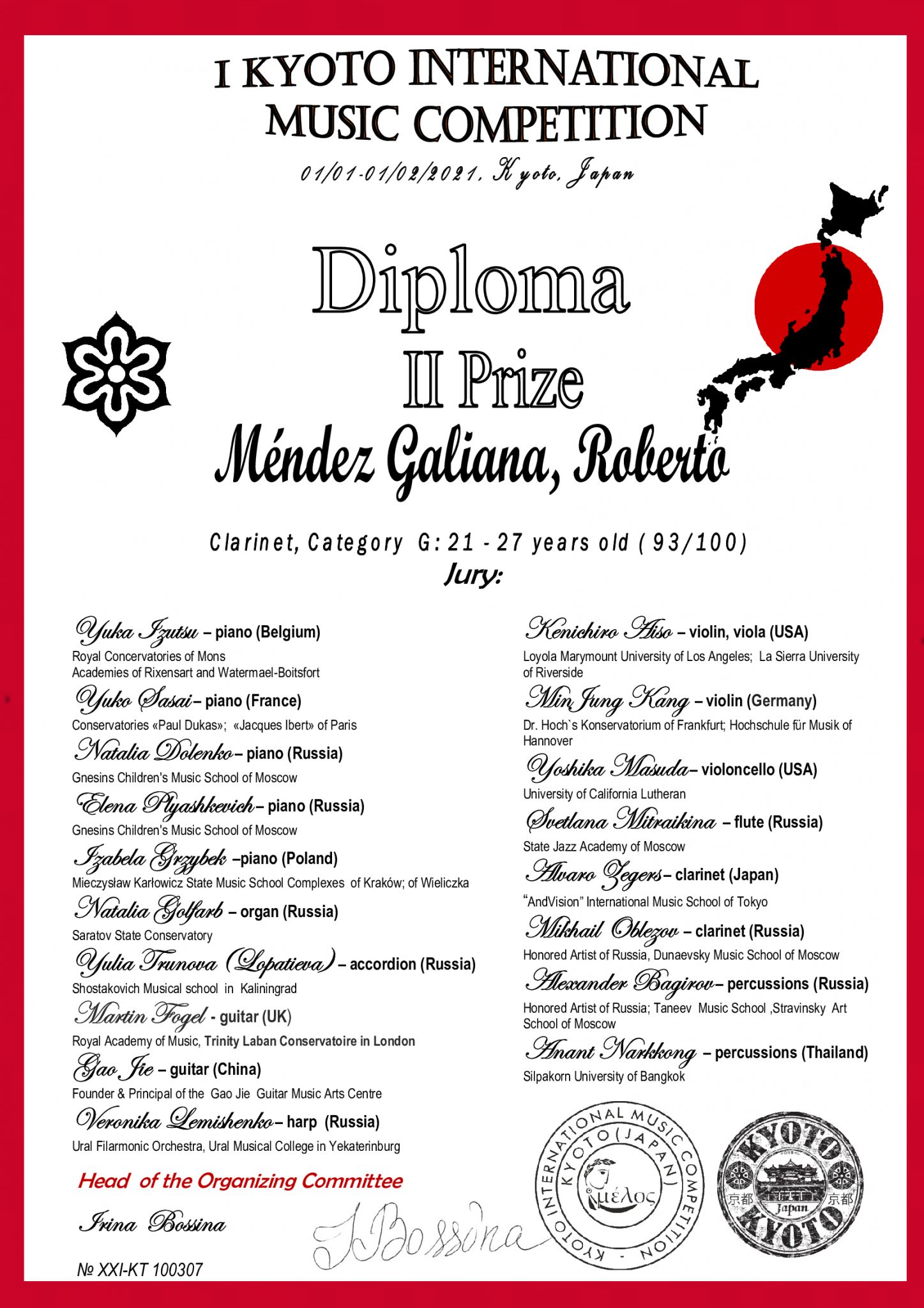 w czerwcu 2021 r. - II miejsce /w kategorii G/ w Międzynarodowym Konkursie Muzycznym I Kyoto International Music Competition, w Kyoto w Japonii, w dniach 01.01-01.02. 2021 r.
