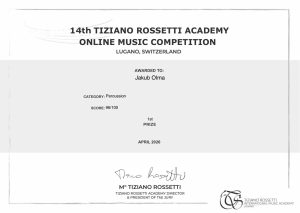 Jakub Olma, student II roku studiów licencjackich w klasie perkusji dra hab. Macieja Hałonia, zdobył I nagrodę w 14th Tiziano Rossetti Academy Online Music Competition, w kwietniu 2026.