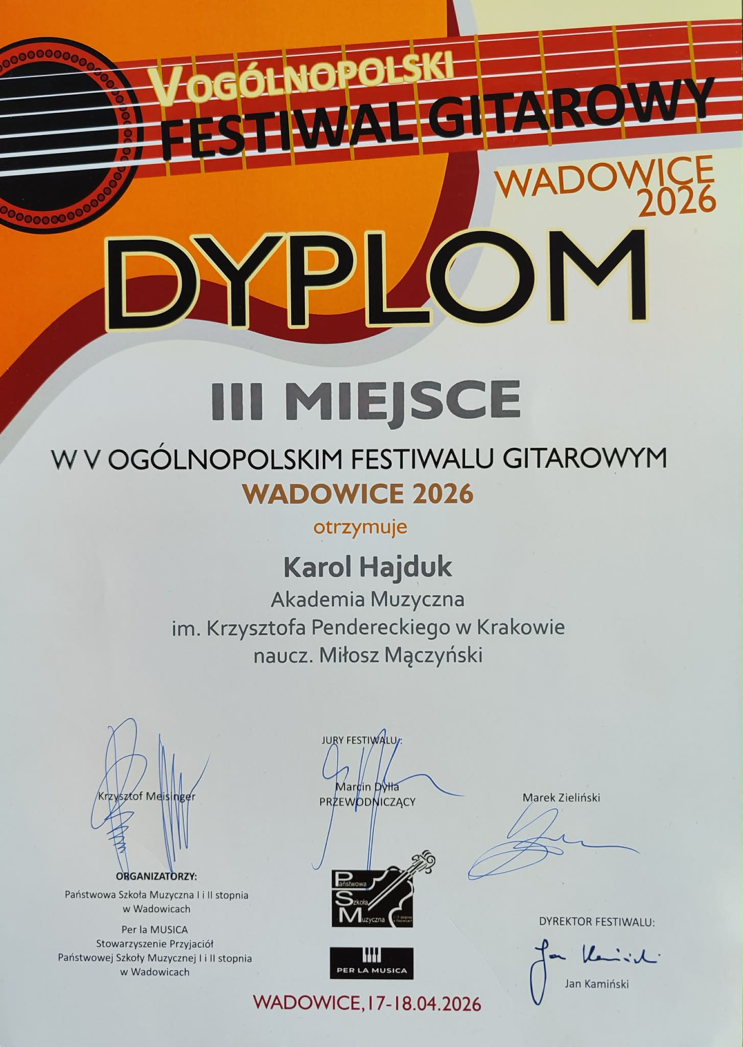 Karol Hajduk, student III roku studiów licencjackich z klasy dra hab. Miłosza Mączyńskiego, zdobył III nagrodę ex aequo w V Ogólnopolskim Festiwalu Gitarowym – Wadowice 2026, który odbył się 18 kwietnia 2026 r.