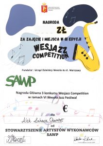 Zespół ALEK ŁACHACZ QUINTET zdobył I nagrodę w ramach III edycji konkursu Wesjazz Competition. Koncert laureatów odbył się 30.11.2025 w Warszawie w ramach VI edycji Wesoła Jazz Festiwal.
