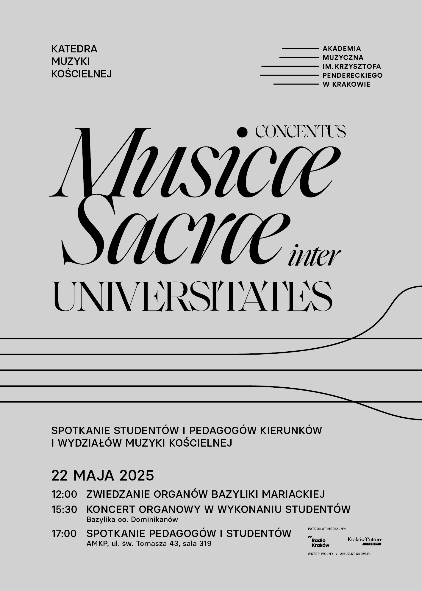 Katedra Muzyki Kościelnej Akademii Muzycznej im. Krzysztofa Pendereckiego w Krakowie ma przyjemność zaprosić do udziału w piątej edycji Concentus Musicæ Sacræ inter Universitates. Wydarzenie to, zapoczątkowane w 2022 roku w Poznaniu przez ks. prof. dr. hab. Mariusza Białkowskiego, ma na celu integrację środowisk akademickich zajmujących się kształceniem muzyków kościelnych. Tegoroczna edycja odbędzie się w Krakowie w dniu 22 maja 2025 roku.