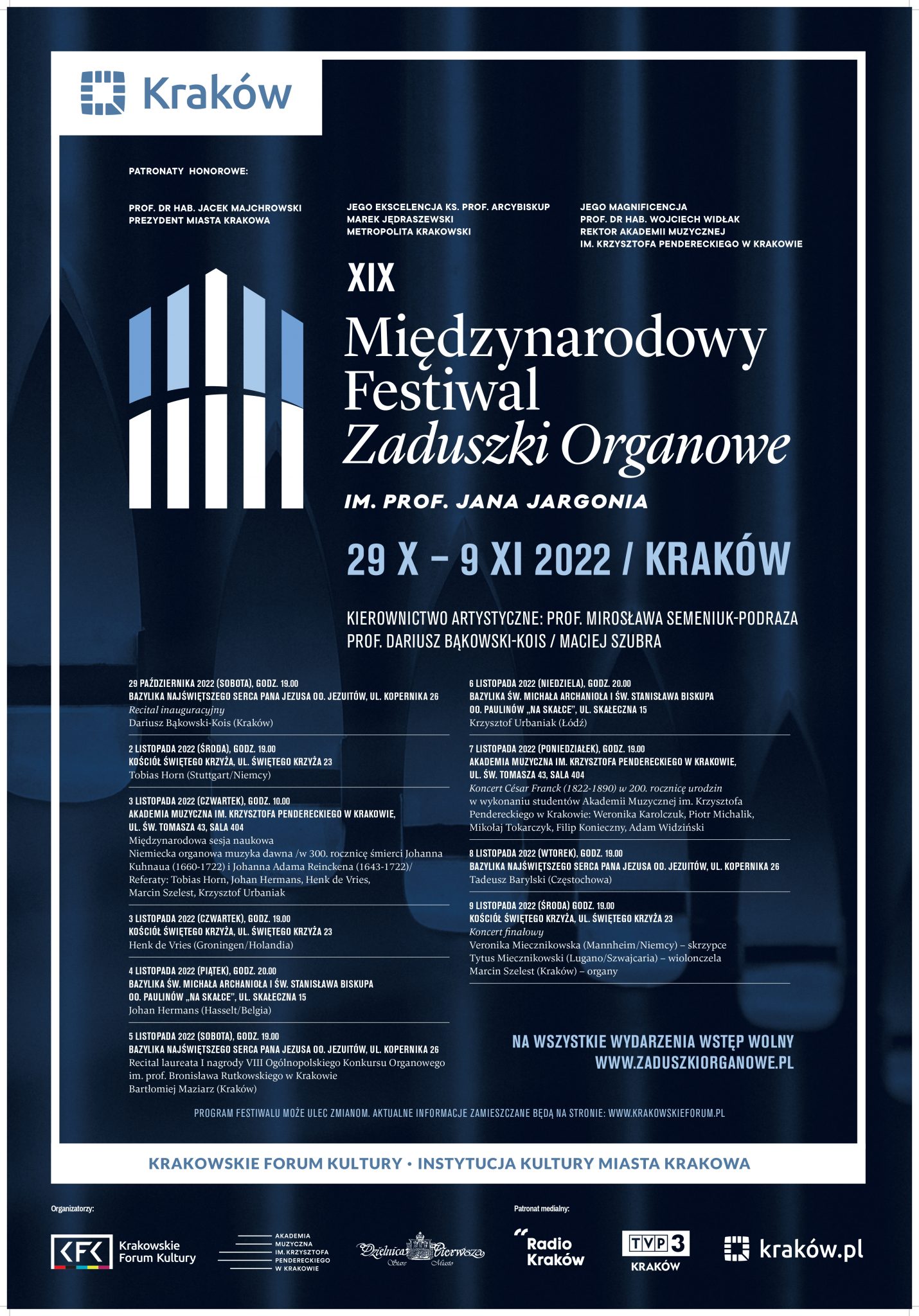 Katedra Organów wraz z Krakowskim Forum Kultury zapraszają na sesję naukową i koncert w ramach XIX Międzynarodowego Festiwalu „Zaduszki organowe im. prof. Jana Jargonia”, który odbędzie się w Krakowie w dniach 29 października – 9 listopada 2022.