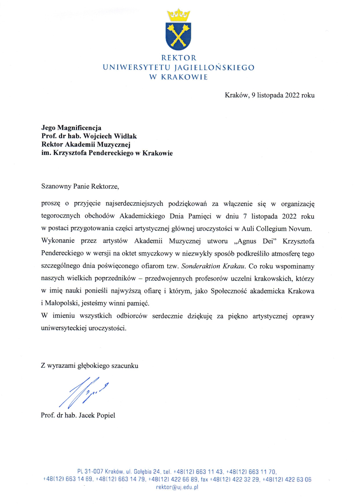 Dziękujemy wszystkim zaangażowanym za włączenie się w obchody. Specjalne podziękowania dla Oktetu Wiolonczelowego przesyła także Rektor Uniwersytetu Jagiellońskiego, prof. dr hab. Jacek Popiel.