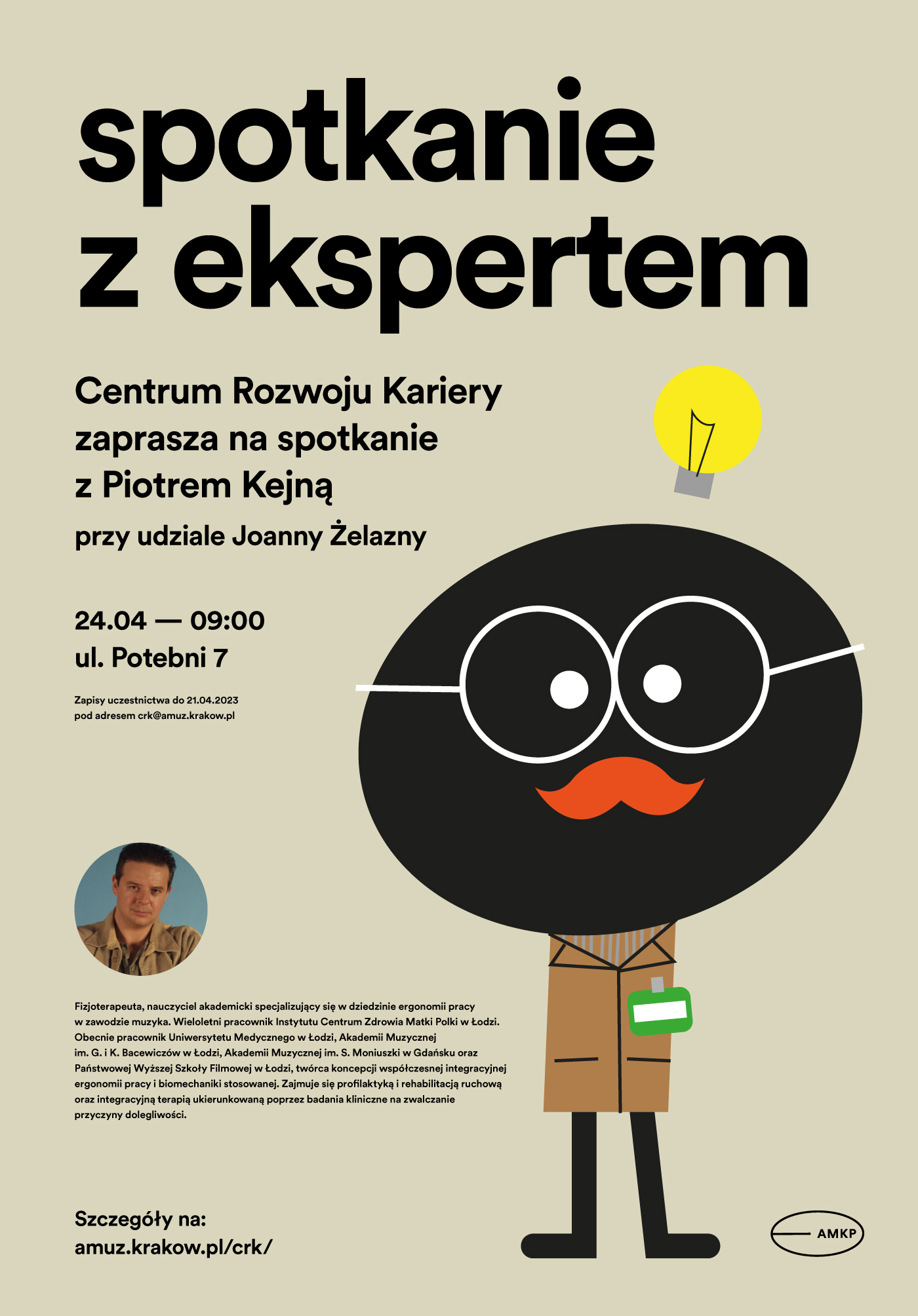 Na spotkanie obowiązują ZAPISY – do piątku 21 kwietnia 2023 r. Liczba miejsc jest ograniczona. Aby się zapisać – należy wysłać na adres crk@amuz.krakow.pl mail z następującymi informacjami: