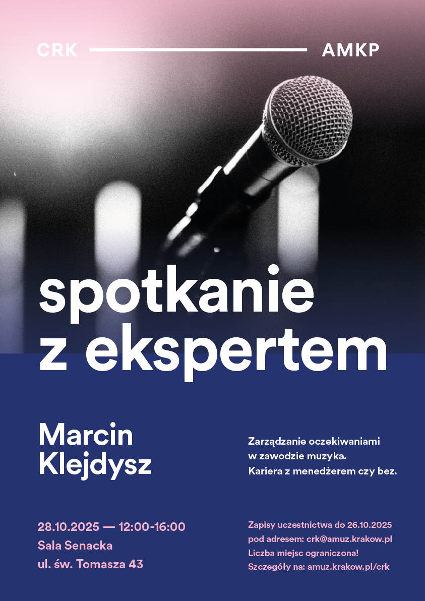 Zapisy uczestnictwa do 26.10.2025 (niedziela) pod adresem: crk@amuz.krakow.pl. W wiadomości mailowej prosimy o podanie kierunku studiów oraz numeru albumu.
