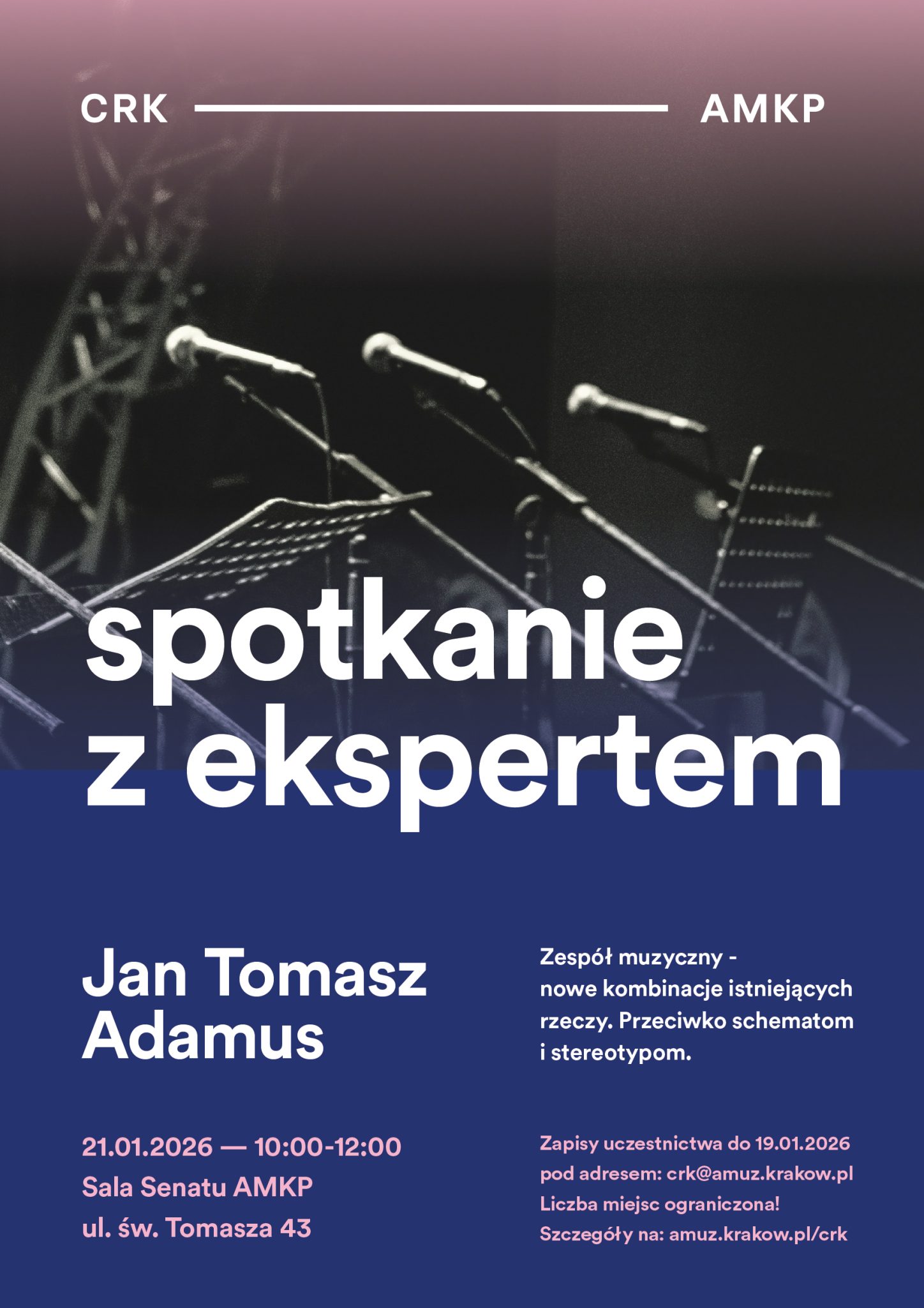 Zapisy uczestnictwa do 19.01.2026 (poniedziałek) pod adresem: crk@amuz.krakow.pl. W wiadomości mailowej prosimy o podanie kierunku studiów oraz numeru albumu.