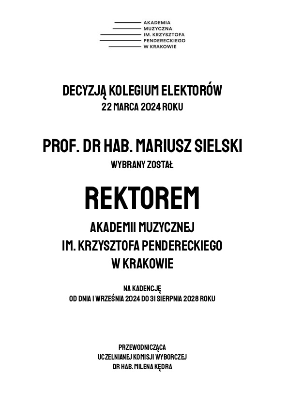 Uczelniana Komisja Wyborcza uprzejmie informuje, iż na zebraniu wyborczym Kolegium Elektorów w dniu 22 marca 2024 roku dokonano wyboru Rektora Akademii Muzycznej im. Krzysztofa Pendereckiego w Krakowie na kadencję trwającą od 1 września 2024 roku do 31 sierpnia 2028 roku.
