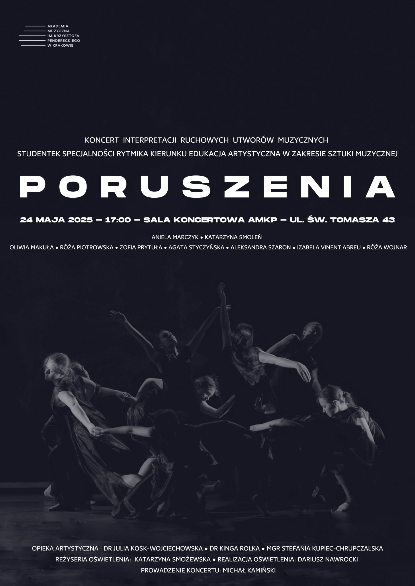 Katedra Badań Muzyczno-Edukacyjnych zaprasza na koncert interpretacji ruchowych utworów muzycznych PORUSZENIA specjalności rytmika kierunku Edukacja artystyczna w zakresie sztuki muzycznej AMKP. Koncert jest podsumowaniem rocznej pracy pedagogów oraz studentek specjalności Rytmika AMKP.