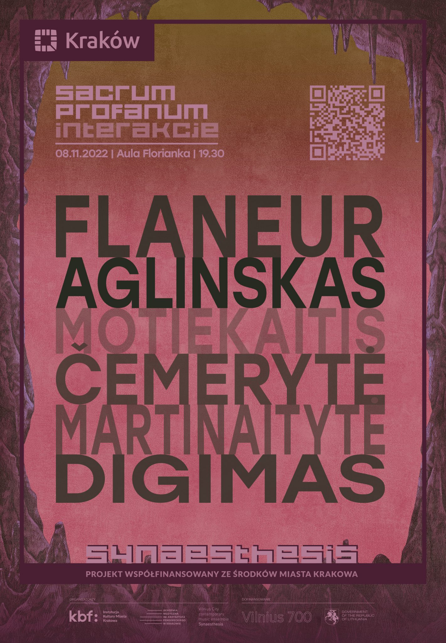 W ramach cyklu Sacrum Profanum: Interakcje wystąpi jeden z najbardziej cenionych litewskich zespołów – Contemporary Music Ensemble Synaesthesis. Zabierze publiczność w podróż – między innymi po opuszczonym mieście. Muzyka litewskich minimalistów skłania do refleksji na temat kryzysów, z jakimi się mierzymy, pomagając zarazem odnaleźć spokój, niezbędny, by je przezwyciężyć.