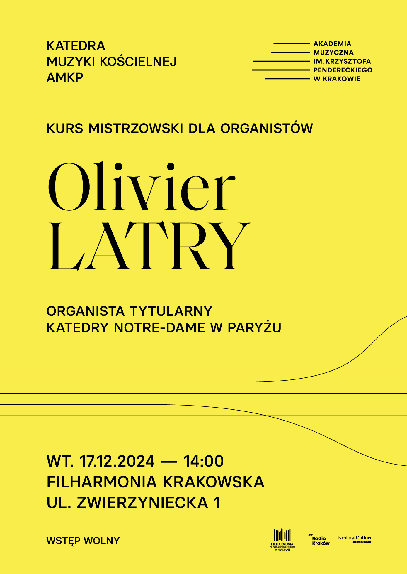 Katedra Muzyki Kościelnej AMKP oraz Filharmonia Krakowska zapraszają na kurs mistrzowski, który poprowadzi Olivier Latry – organista tytularny Katedry Notre-Dame w Paryżu. Wydarzenie odbędzie się 17 grudnia 2024 r. o godz. 14:00 przy organach w sali głównej Filharmonii Krakowskiej.