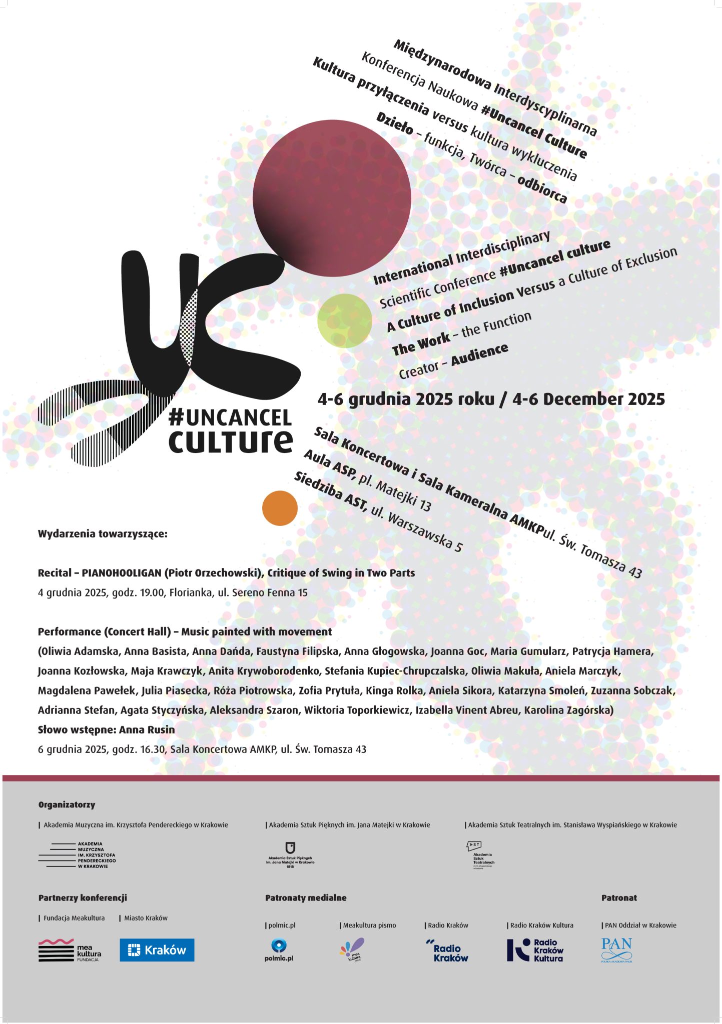 Researchers are encouraged to present papers in a broad interdisciplinary context, combining the fields of music theory/musicology, media studies, film studies, performance studies, cultural studies, literary studies, sociology, visual arts and performing arts. The language of the conference will be English. We invite you to submit abstracts for 20-minute presentations in English to uncancel@amuz.krakow.pl by June 20th, 2025. Please attach two files in Word (.docx) format: All abstracts will undergo a review process by the programme committee and authors will be notified of their acceptance by July 1st, 2025. Decisions on your proposal will be communicated by email, as will registration information. Selected papers will be included in a planned post-conference publication. Conference fee Academics and participants without afiliation: EUR 130 (full amount) The fee does not include travel and accommodation costs. The organisers offer assistance in booking accommodation in Krakow at favourable prices. Participants representing the organising institutions will be entitled to an 80% discount on the conference fee. The fee shall be paid by July 15th, 2025.