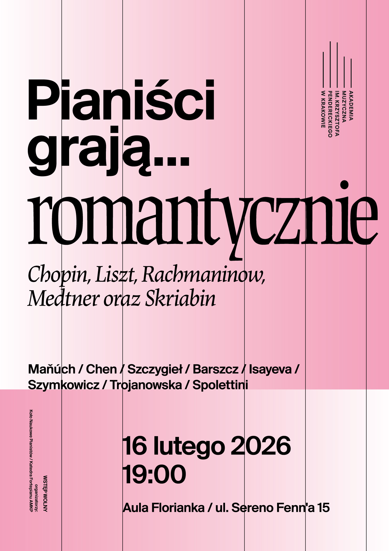 W Auli Florianka zabrzmią utwory wybitnych kompozytorów epoki romantyzmu: Chopina, Liszta, Rachmaninowa, Medtnera oraz Skriabina. Podczas koncertu wystąpią studenci i studentki Koła Naukowego Pianistów Akademii Muzycznej im. Krzysztofa Pendereckiego w Krakowie.